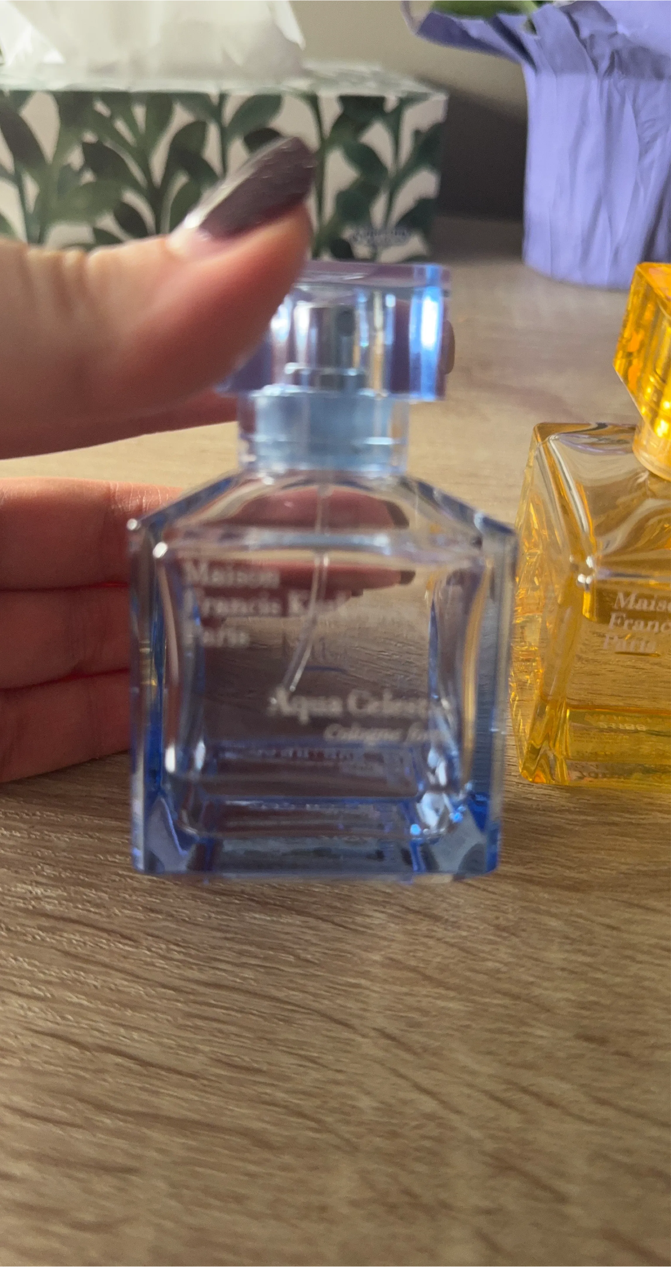 Maison Francis Kurkdjian Aqua Celestia Cologne Forte. It's a fragrance with a fresh scent. Bottle is clear blue glass with a blue cap. 40% left