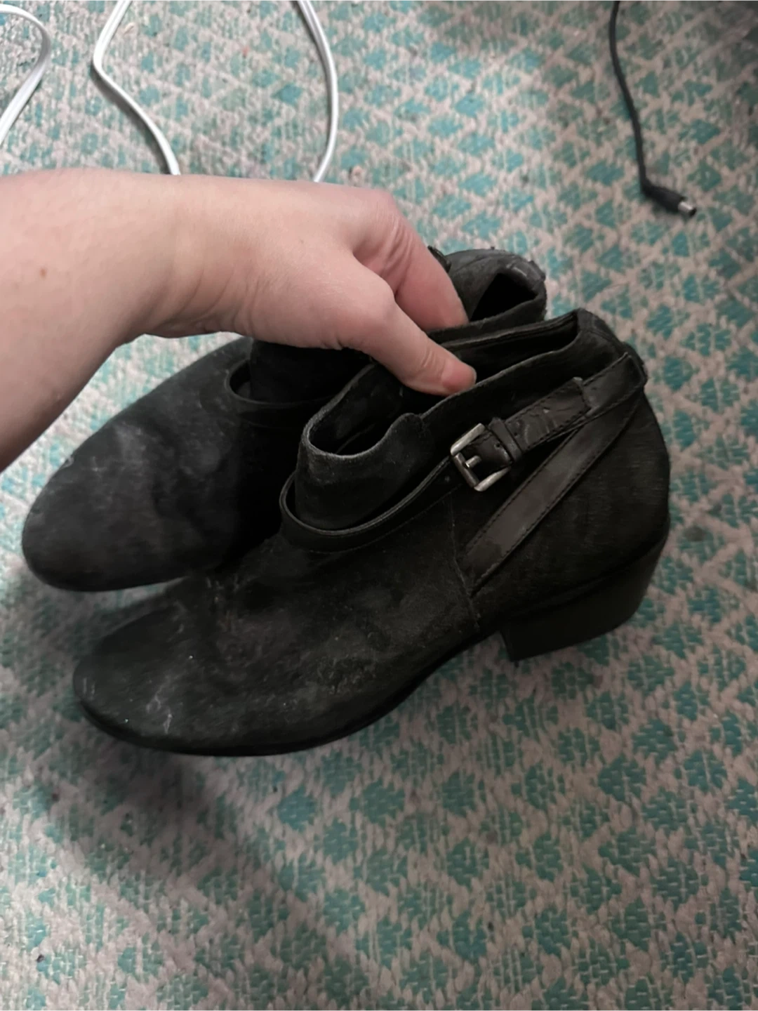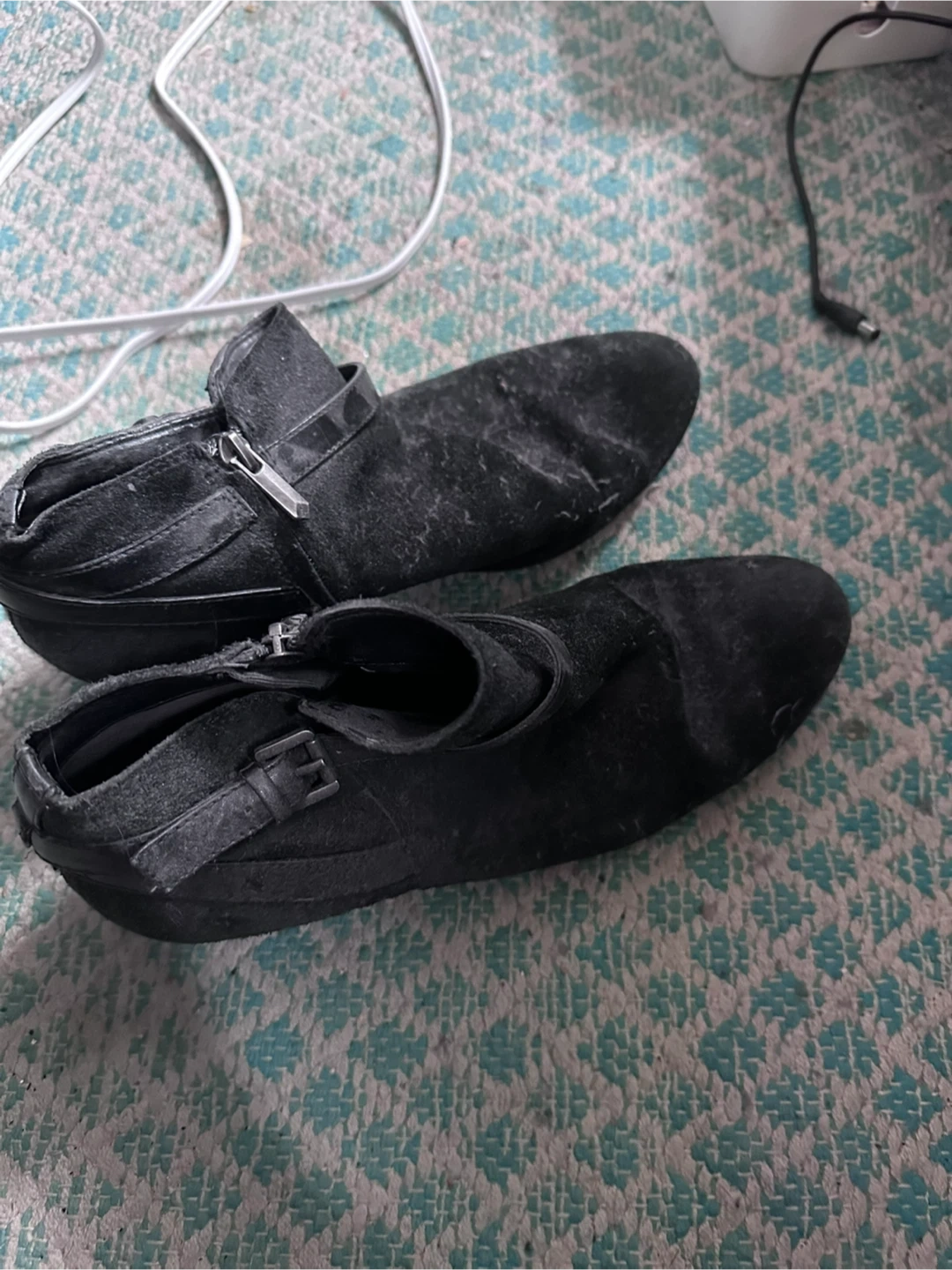 These boots have been gently worn and remain in great overall condition. The suede shows minor surface dust from storage that can easily be refreshed with professional or at-home suede cleaning. The boots have naturally softened and molded comfortably from wear, making them easy to slip on and comfortable for extended