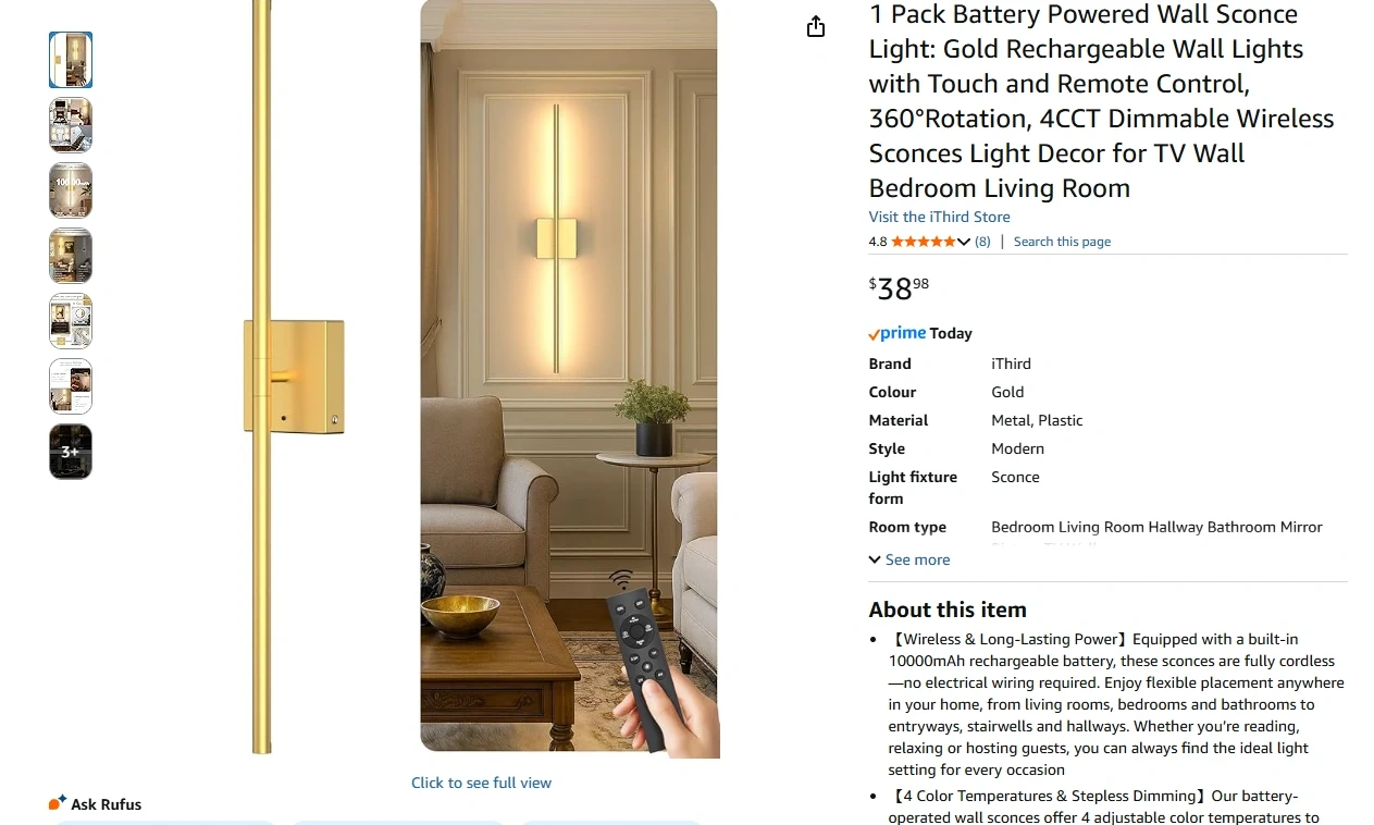Battery Operated Wall Sconce Gold 10000mAh Rechargeable Wall Lights with Touch and Remote Control, 360° Rotate Wireless Wall Scone Decor for TV/Mirror Bedroom Living Room, Brand New in the Box