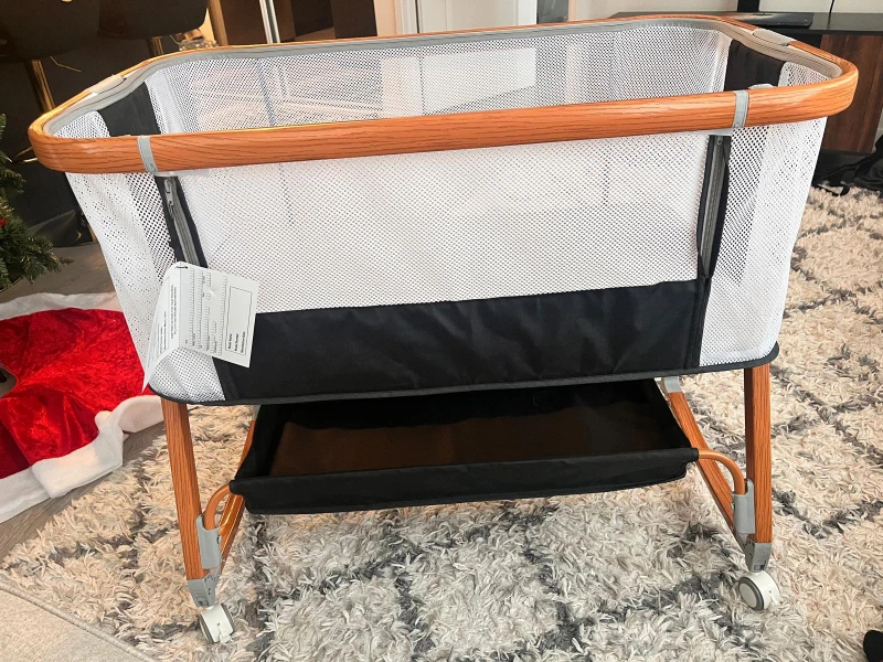 This bassinet features breathable mesh sides and a wooden-style frame. It includes a storage basket underneath for convenience. It's suitable for keeping your baby close. Used for Just a month