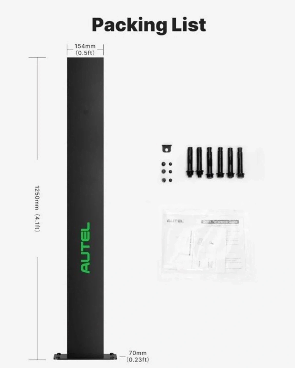 Autel Maxicharger AC Wallbox Pedestal. Includes fixing lug and screws. This pedestal is 1250mm (4.1ft) tall and 154mm (0.5ft) wide. Made of durable metal.