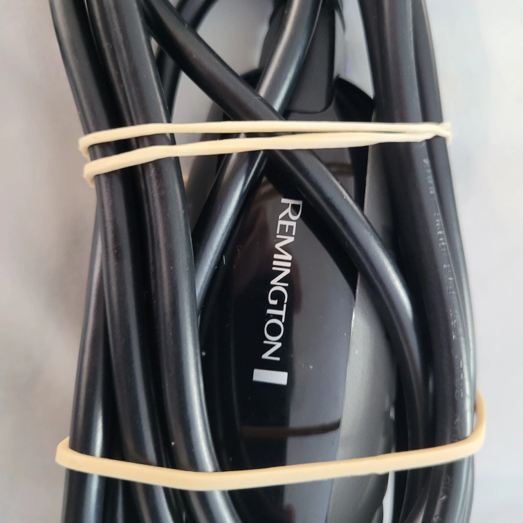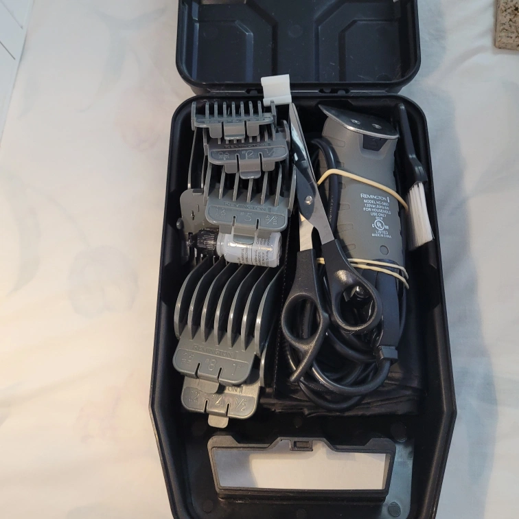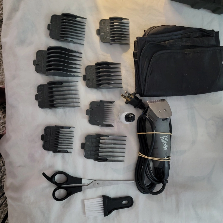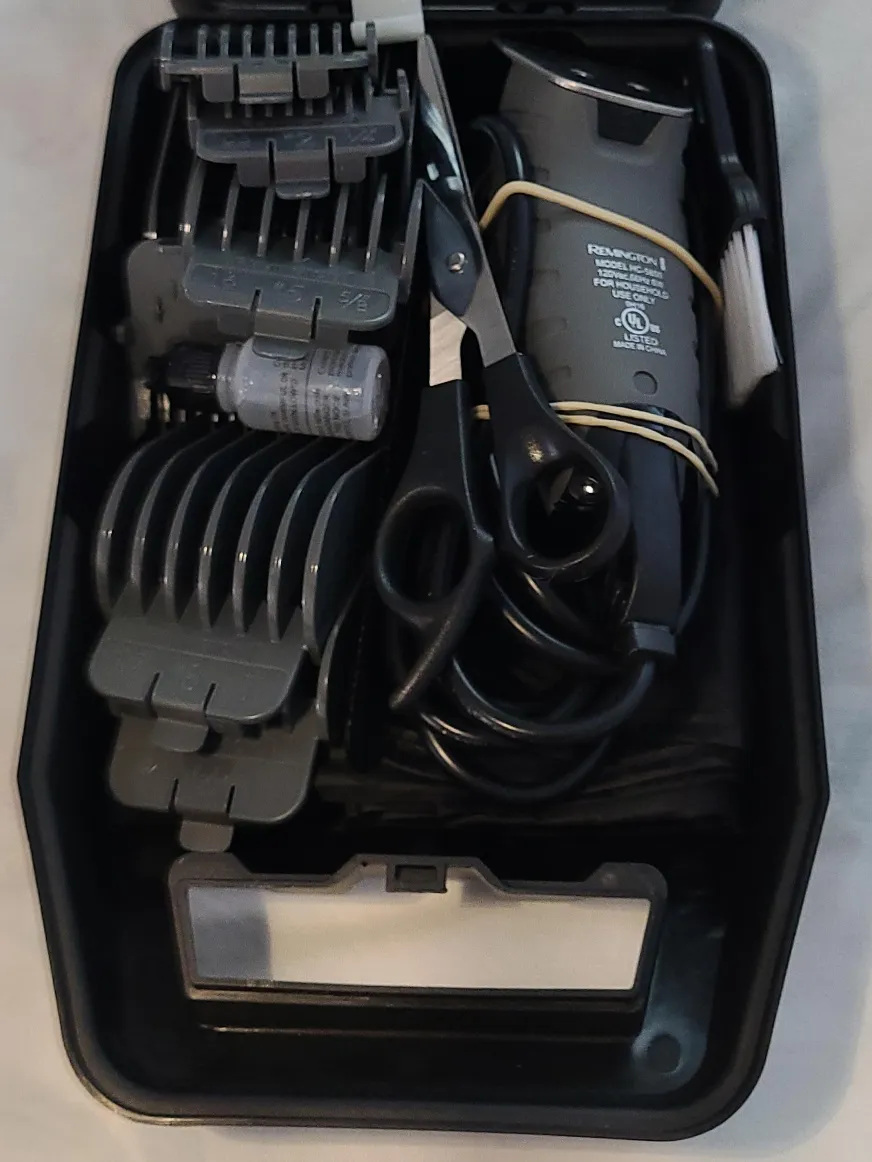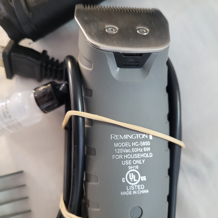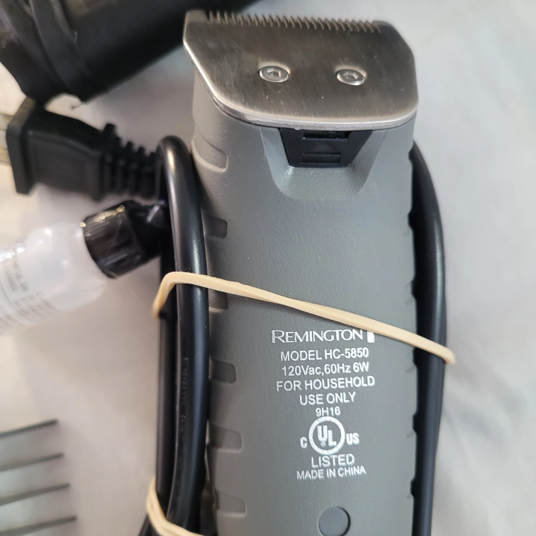 Selling a Remington HC-5850 hair clipper set. It comes with multiple guide combs, scissors, a cleaning brush, and oil. The clipper is in good condition and ready for use. It has a power rating of 120Vac, 60Hz, and 6W