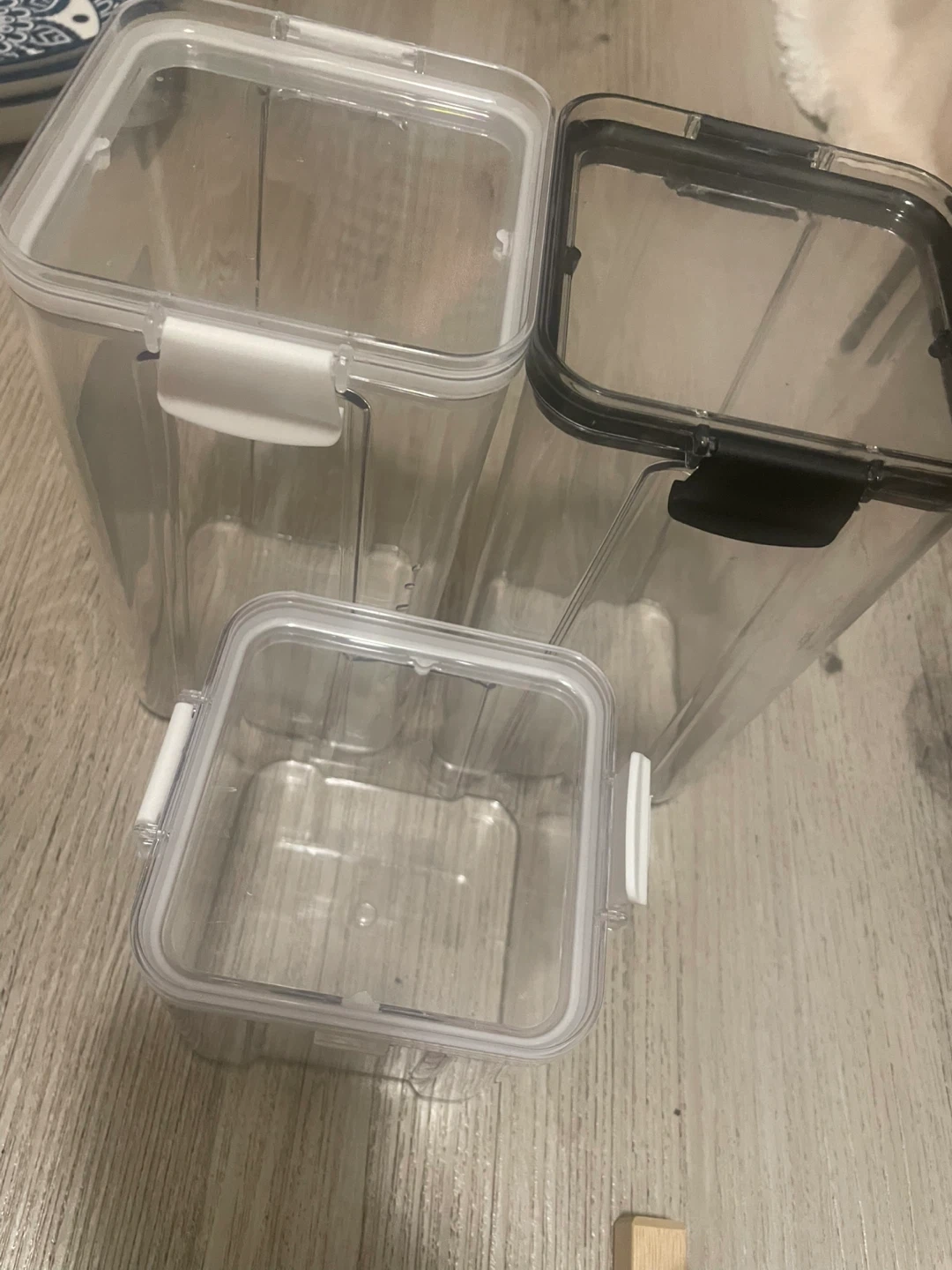 This set includes three clear plastic food storage containers with airtight lids. They're great for organizing your pantry or fridge. Containers are made of clear plastic with either white or black locking lids.