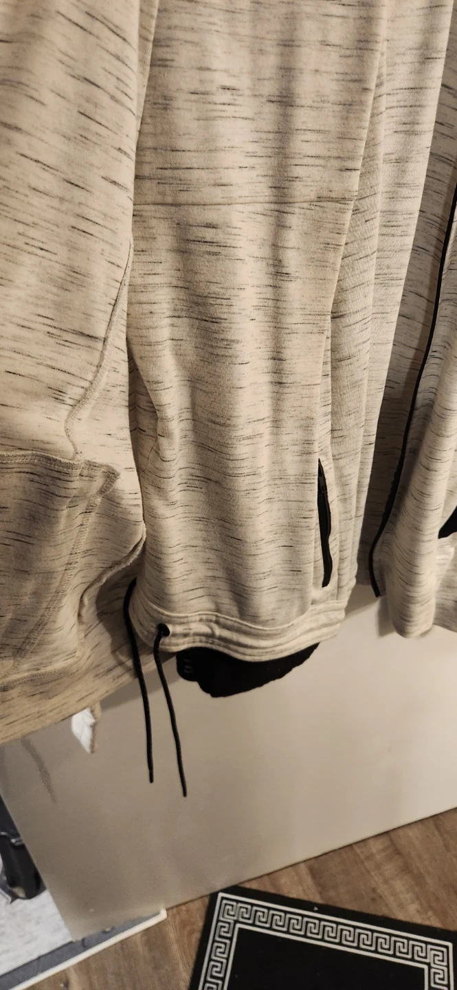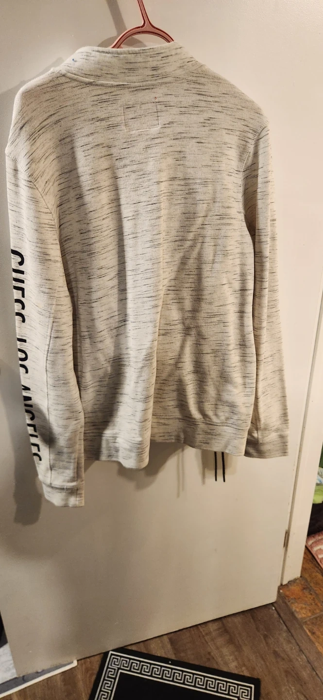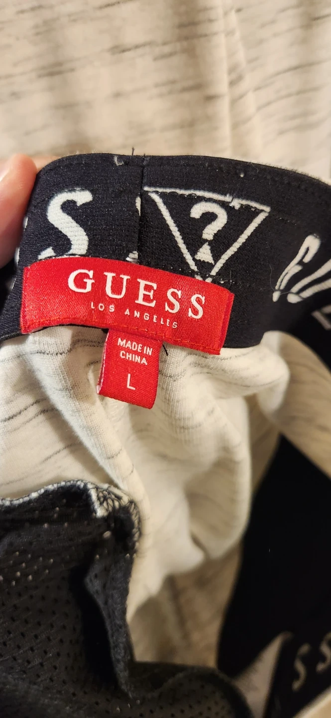 This is a Guess tracksuit in a size large that is in excellent condition . The jacket is a cream colour with black stripes and the words 'Guess' and 'Guess Los Angeles' written on it that comes with a matching pants.