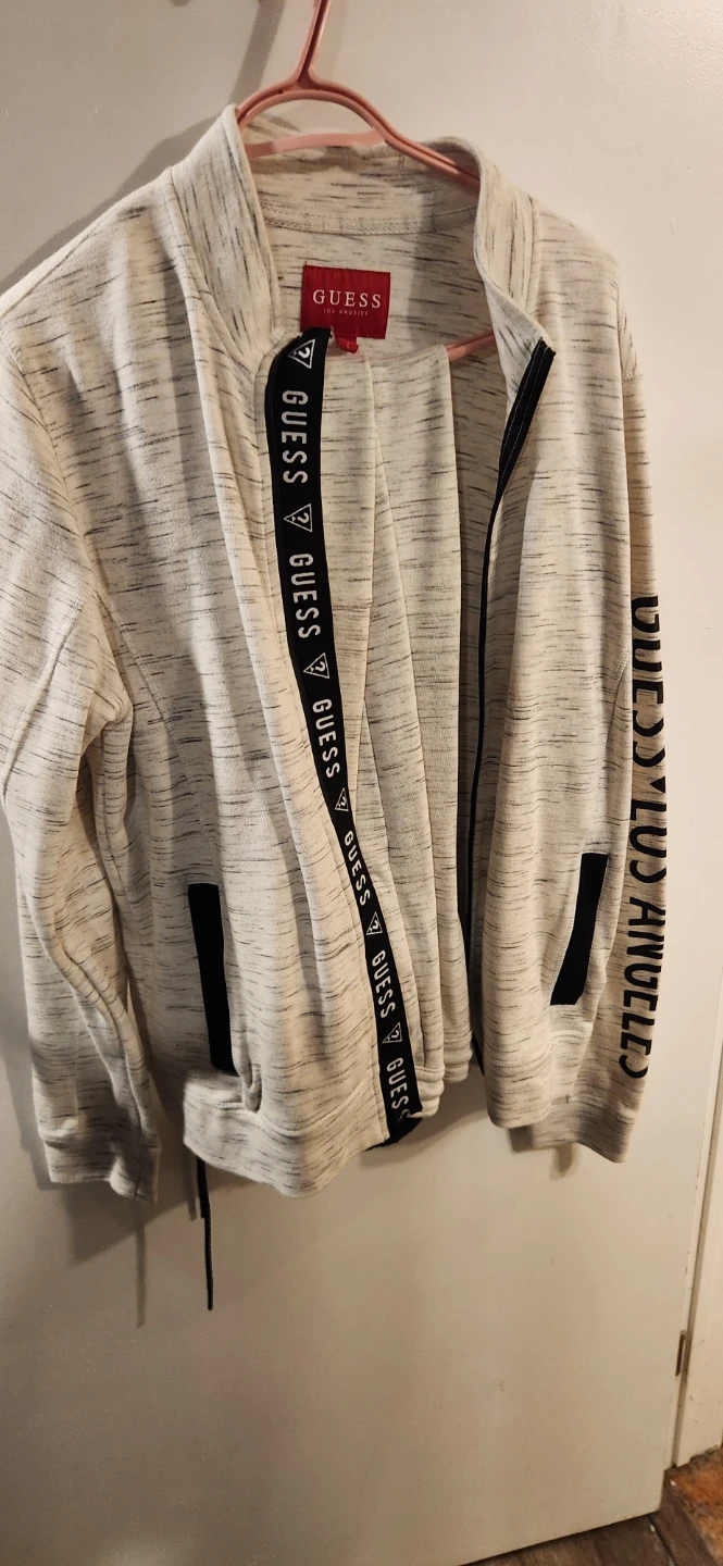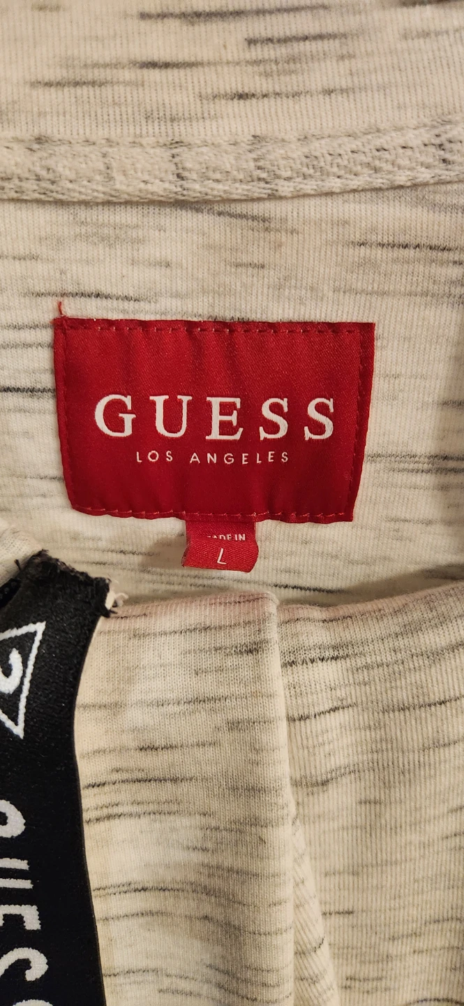 This is a Guess tracksuit in a size large that is in excellent condition . The jacket is a cream colour with black stripes and the words 'Guess' and 'Guess Los Angeles' written on it that comes with a matching pants.
