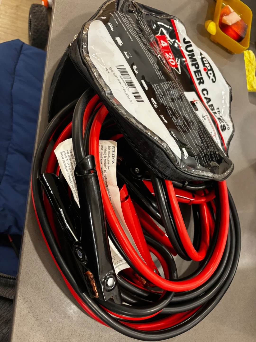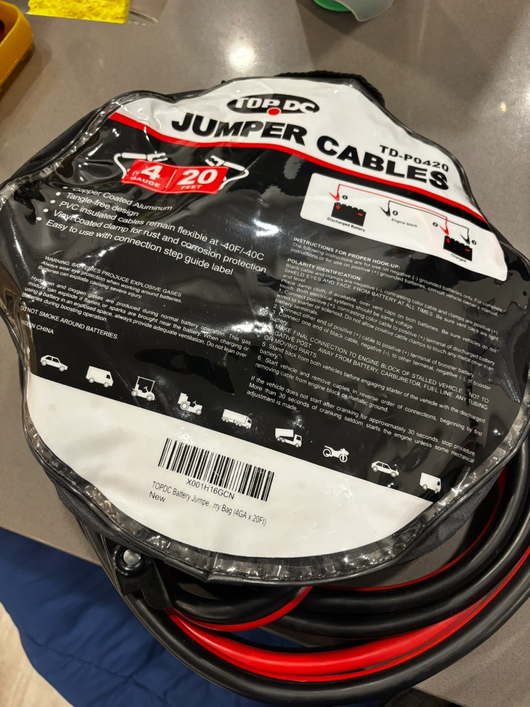 These TOPDC jumper cables are 20ft long and 4 gauge. They feature a heavy-duty clamp design and are suitable for use in temperatures from -40F to 40F. Comes with a PVC insulated tangle-free design. The cables are designed for easy and safe use with connection step guide.