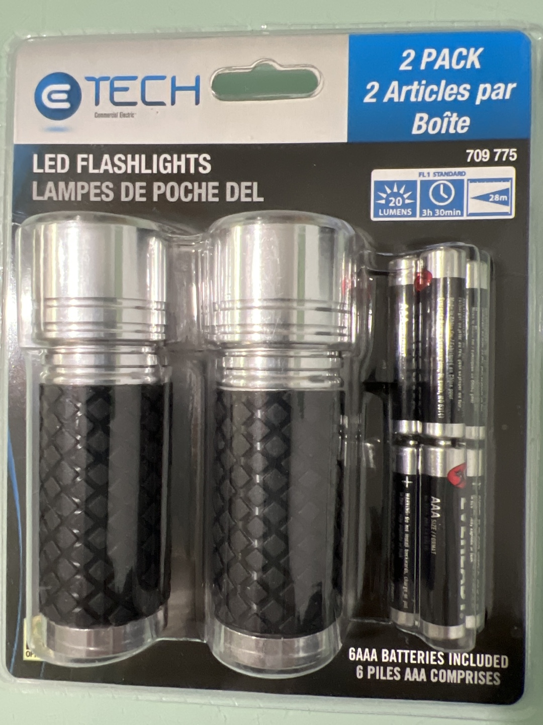 2 LED flashlights with 6 AAA batteries included. 20 lumens. Pickup at Yonge and Finch only.
