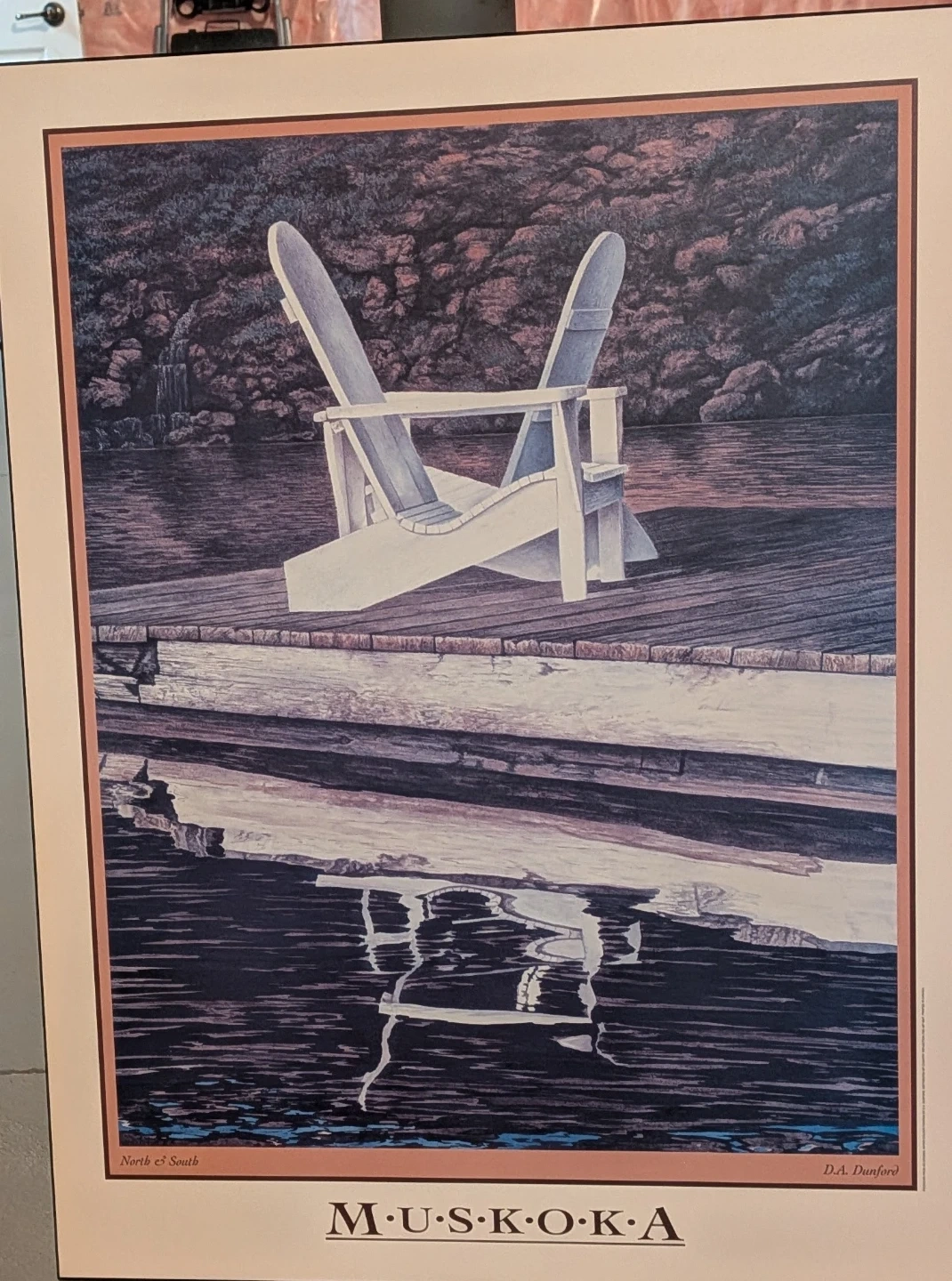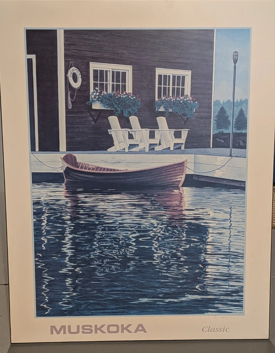 Collection of D.A. Dunford art prints depicting Muskoka scenes. Prints include 'Old Friends', 'North & South', 'Classic', 'Geraniums', and 'Boathouse Window'.