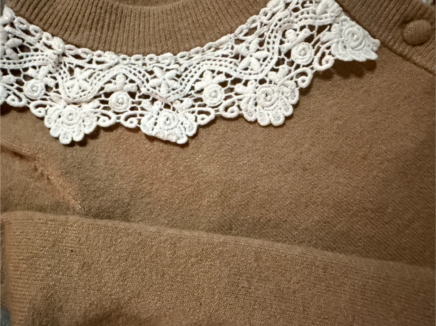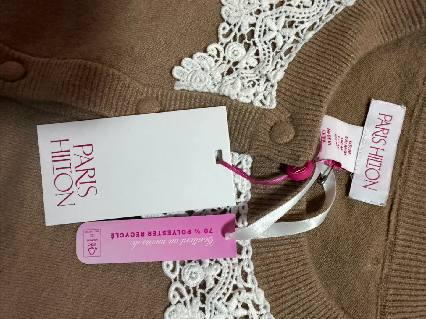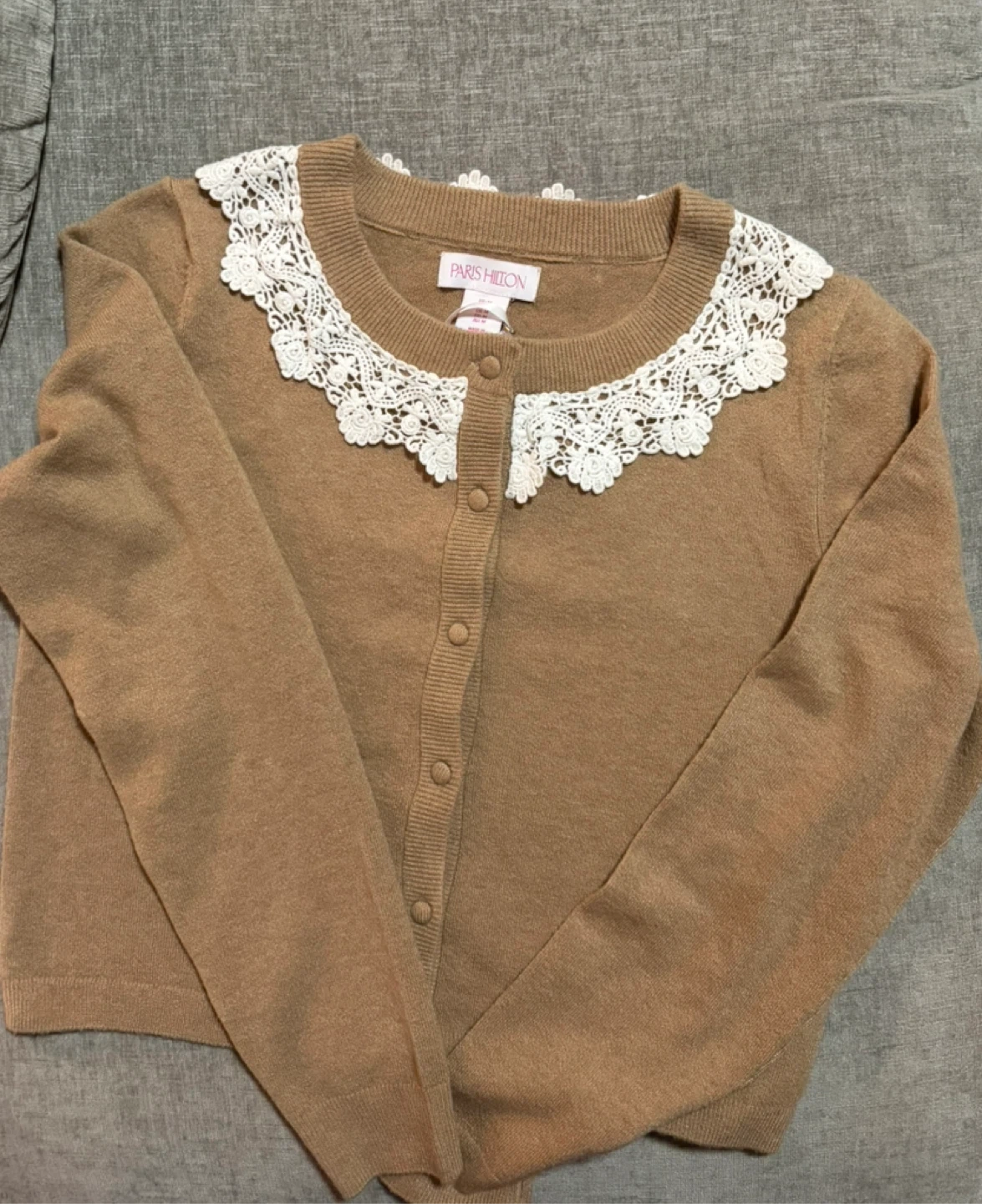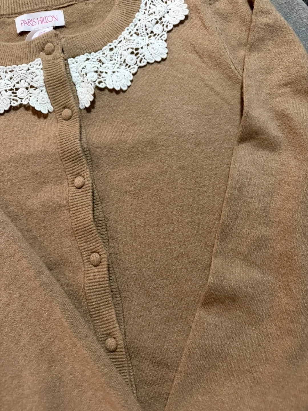 This is a lovely brown Paris Hilton cardigan with a delicate white lace collar. The size is medium, it’s so cute and perfect for layering.
