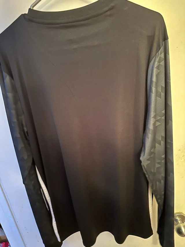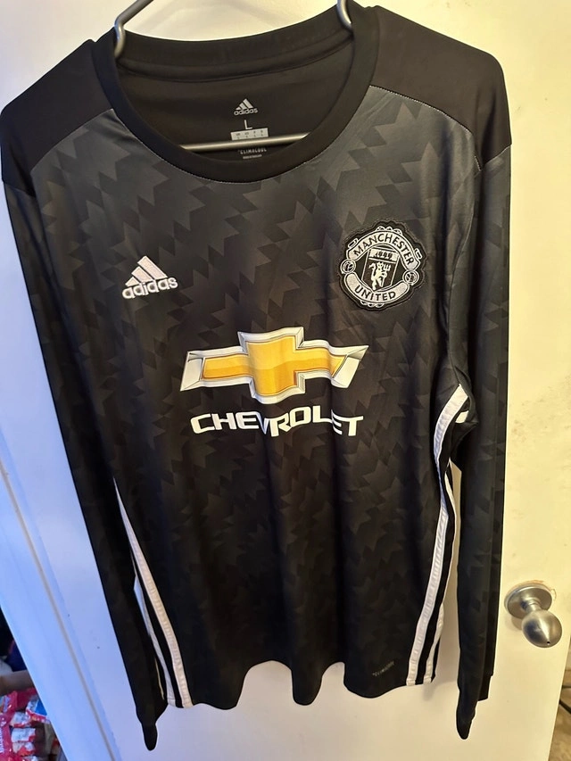 Manchester United away black long sleeve soccer jersey. Perfect condition. Size men's large. Asking $60. Price is firm. From a bug free, smoke free, pet free home. Cash only. Pick up only in the South Pembina, Fort Richmond Area.