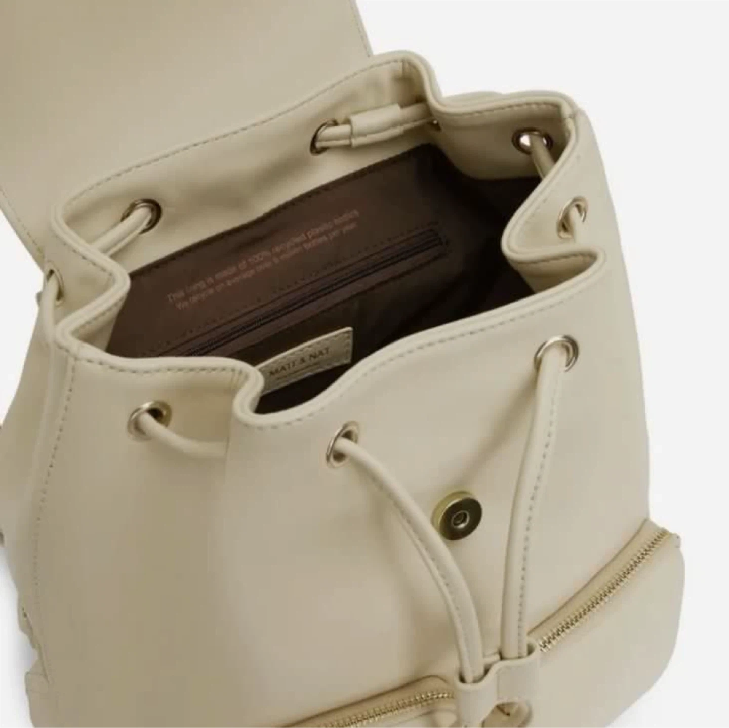 Looking to sell this cute cream-coloured backpack from Matt & Nat! It's made of vegan leather and has a drawstring closure with a flap. The backpack has adjustable straps and a couple of handy pockets on the front. Perfect for everyday use or a weekend adventure