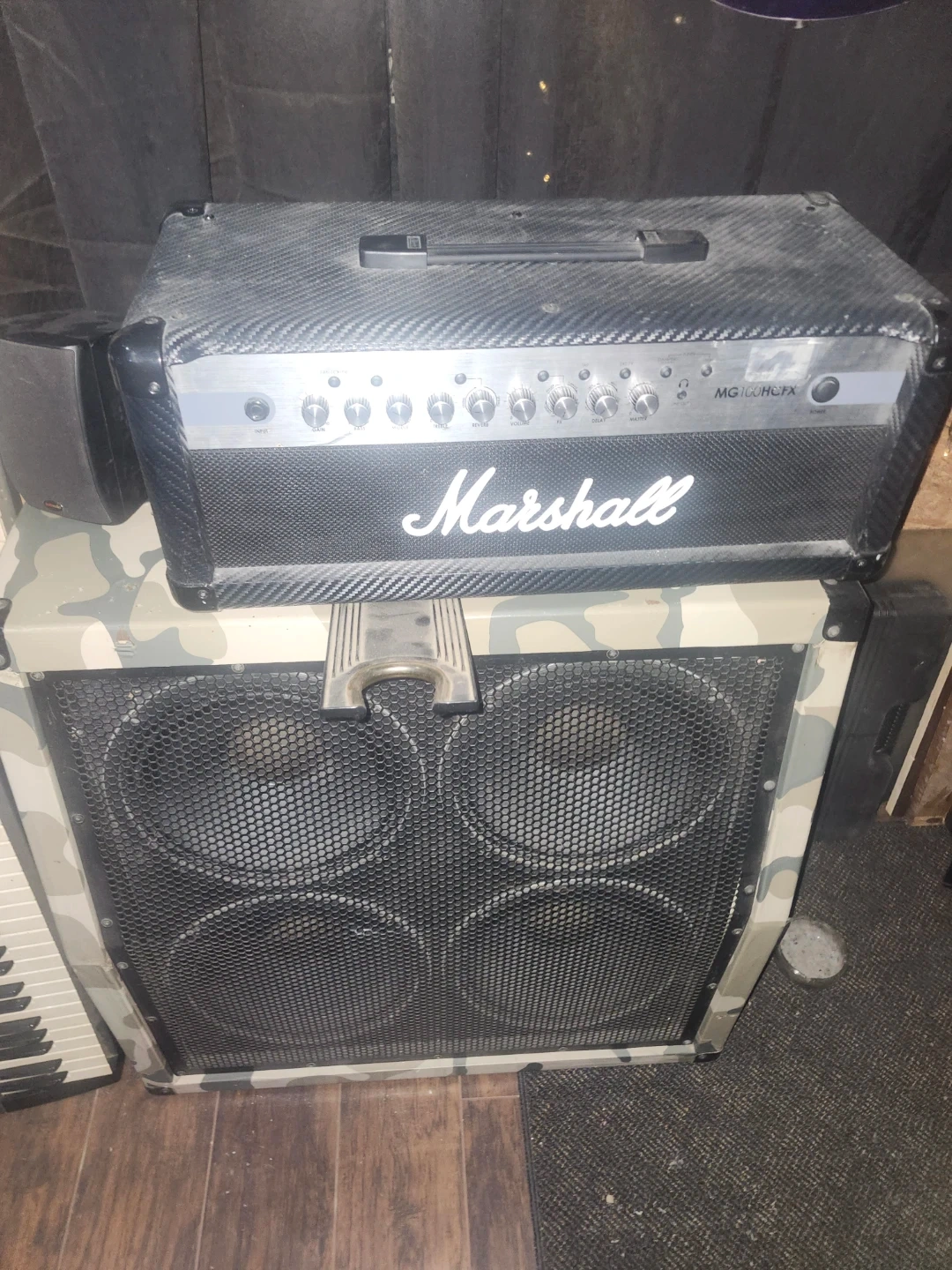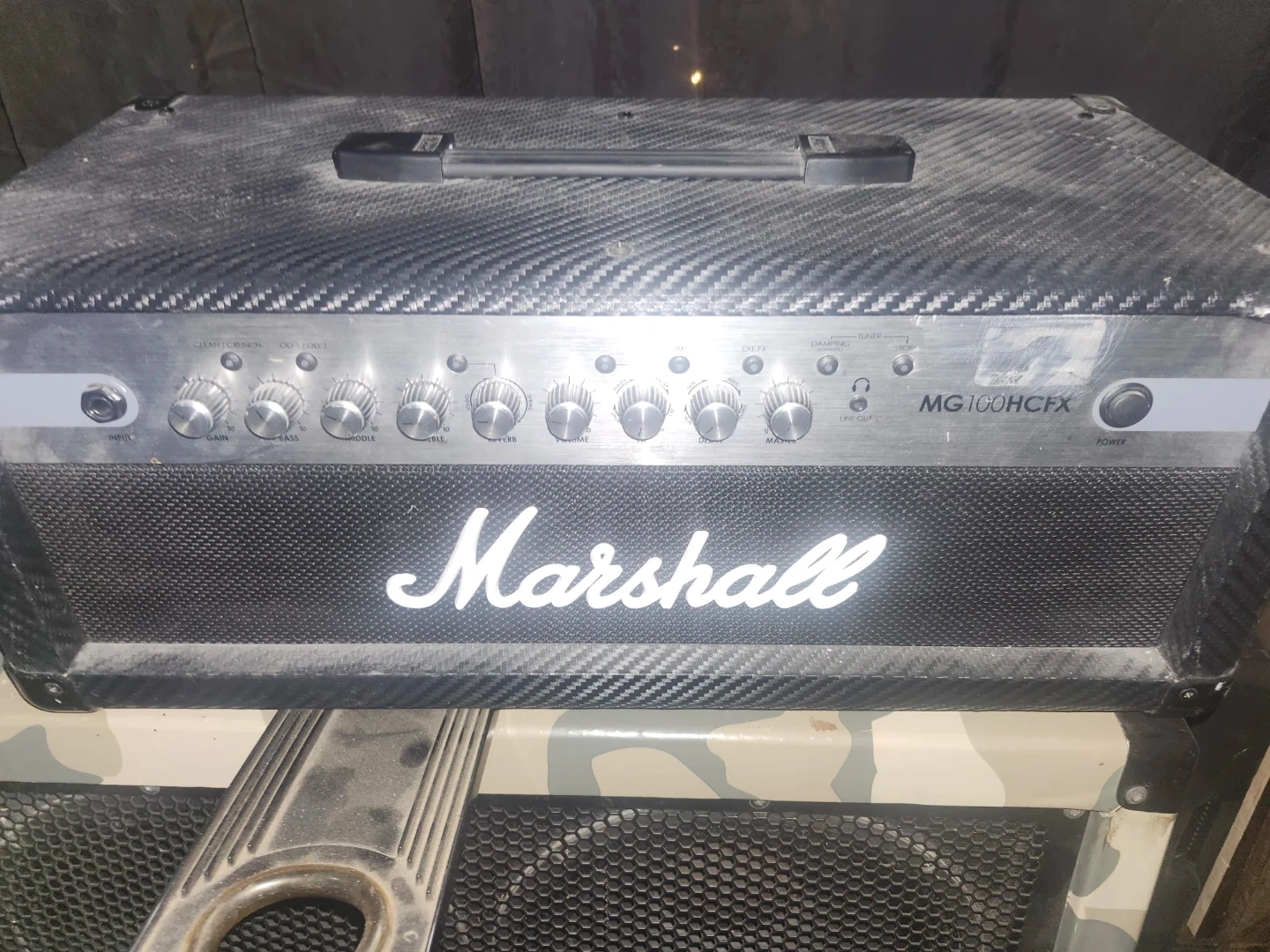 Marshall MG100HCFX amplifier head. It's a 100-watt amp head with built-in effects. Includes headphone out and CD input. Also selling a recovered 4 x 12. Celestion 70-80 loaded cab. 150 for the head and 200 for the cab. The cab needs work but the speakers are in perfect condition.