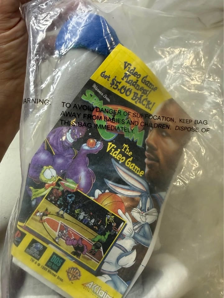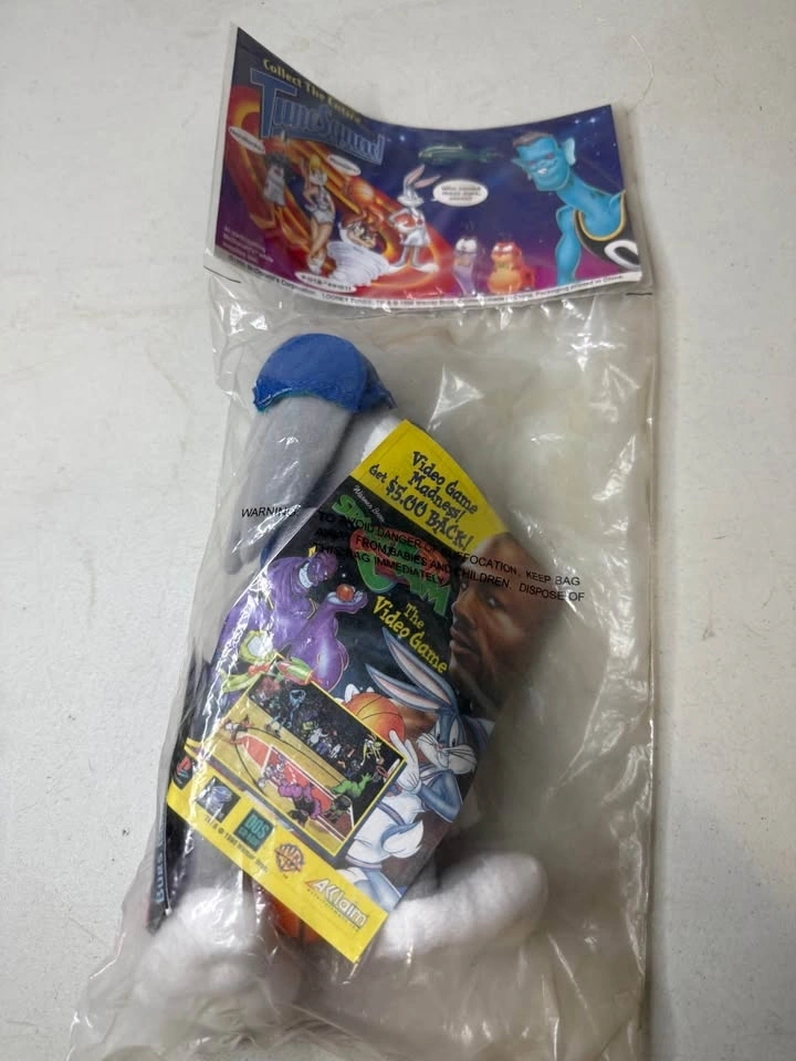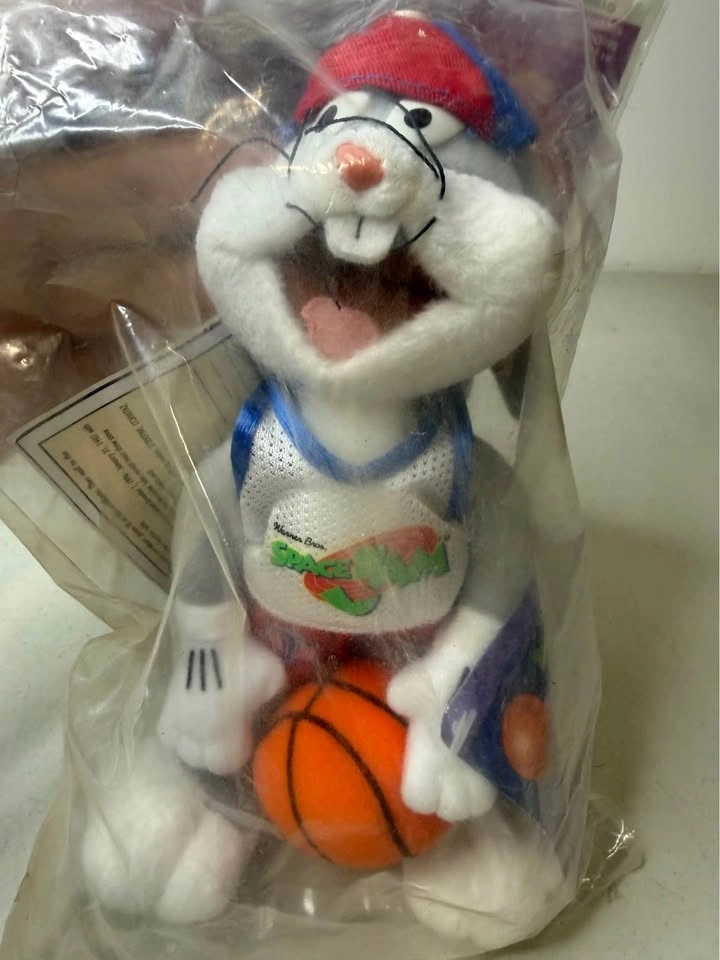 Vintage Bugs Bunny plush from the 1996 McDonald's Space Jam promotion. Features Bugs Bunny wearing the Tune Squad uniform and remains factory sealed in the original packaging. New. Please see photos for the exact item and condition you will receive.