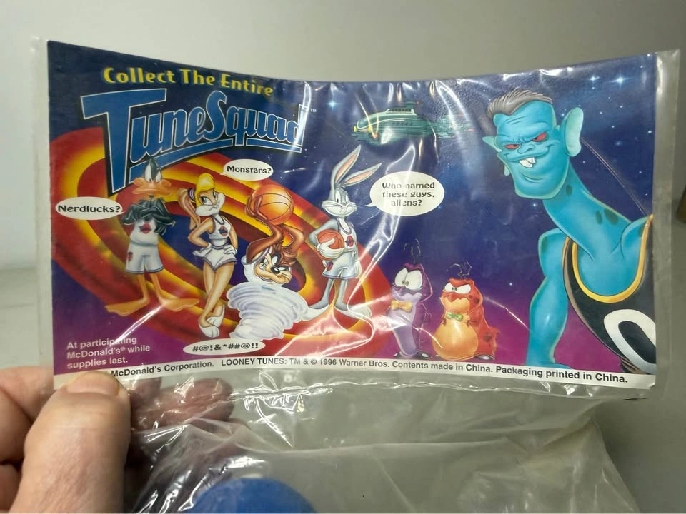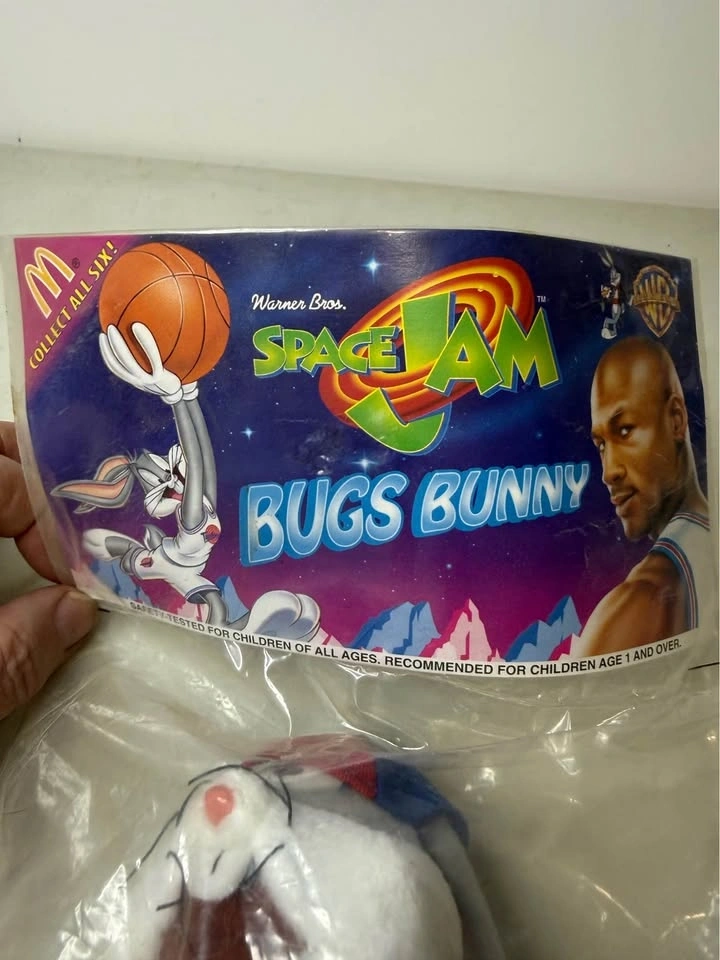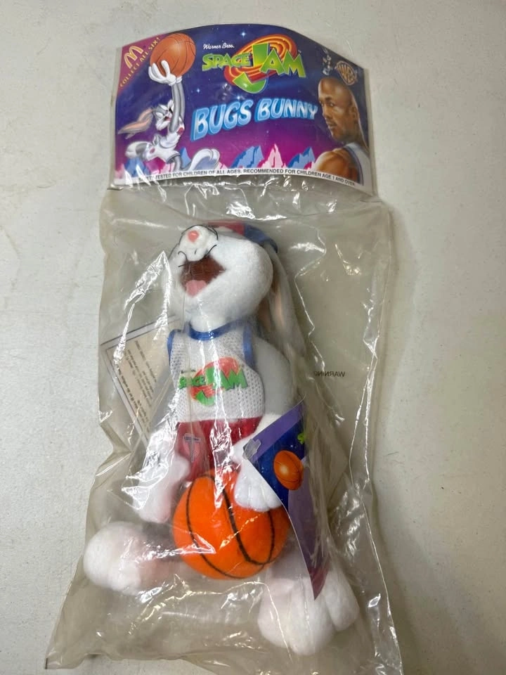 Vintage Bugs Bunny plush from the 1996 McDonald's Space Jam promotion. Features Bugs Bunny wearing the Tune Squad uniform and remains factory sealed in the original packaging. New. Please see photos for the exact item and condition you will receive.