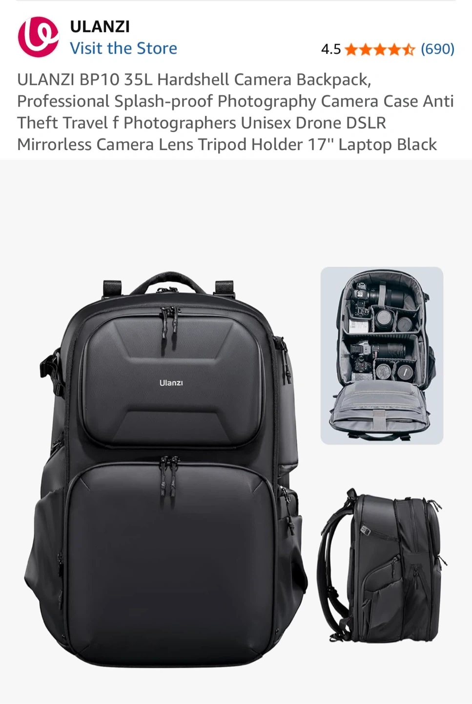 This Ulanzi BP10 camera backpack has a 35L capacity. It's splash-proof and hardshell designed. It's great for photographers needing to protect their gear.