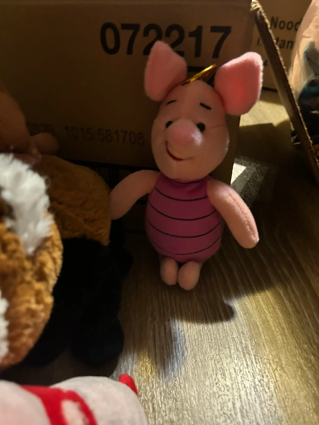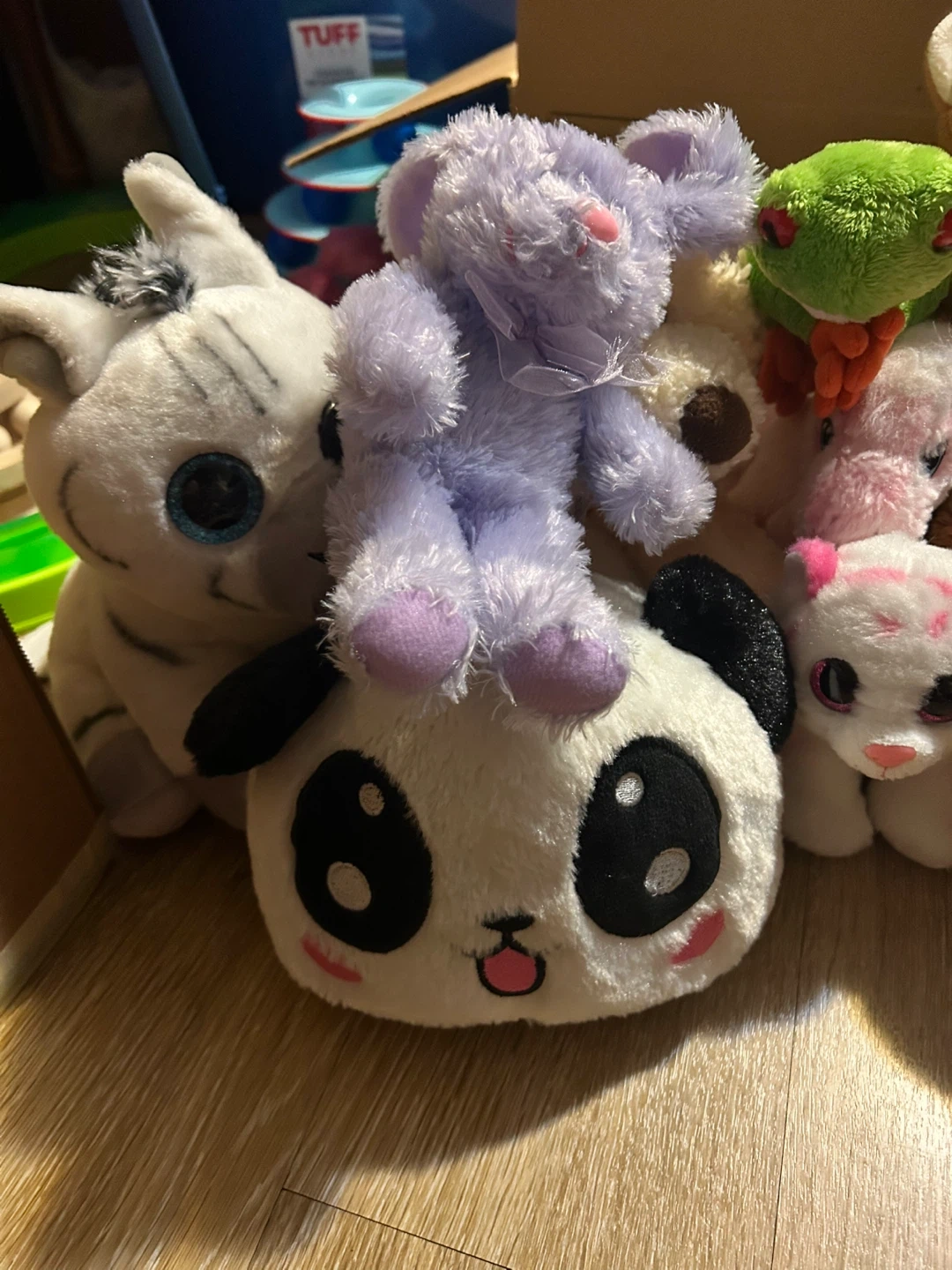A collection of assorted plush toys including a panda, a cat, a red panda, a purple bunny, a frog, and Piglet. Various sizes and soft materials.