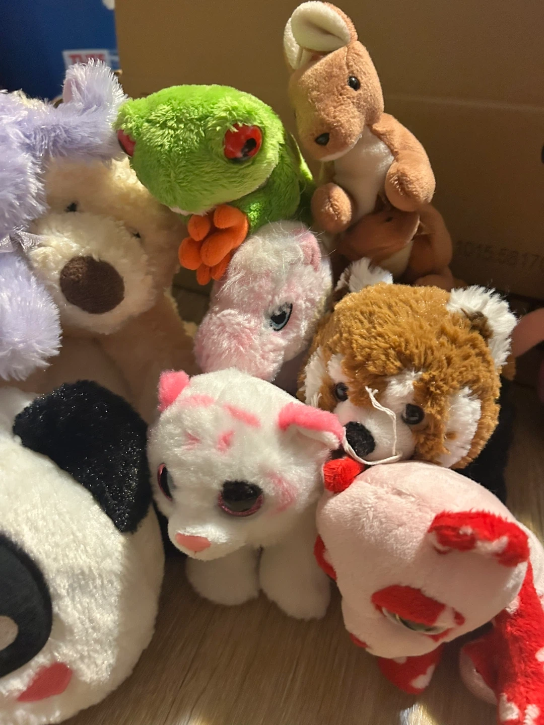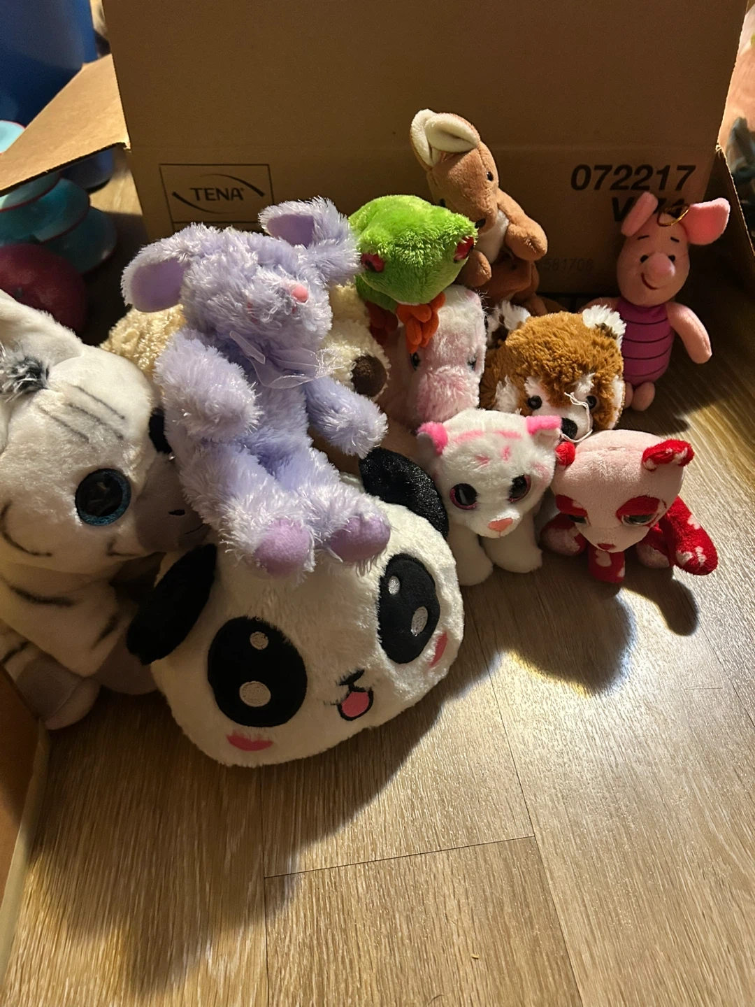 A collection of assorted plush toys including a panda, a cat, a red panda, a purple bunny, a frog, and Piglet. Various sizes and soft materials.