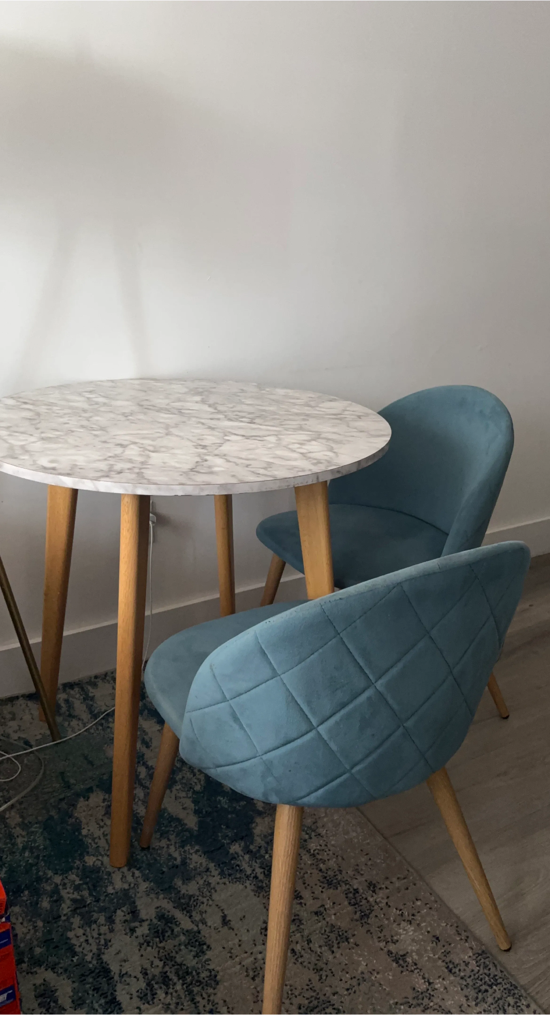 Round dining table with a white marble-look top and wooden legs. Includes two teal velvet chairs with quilted backs and wooden legs. This set's compact size makes it a great option for smaller dining areas or breakfast nooks!
