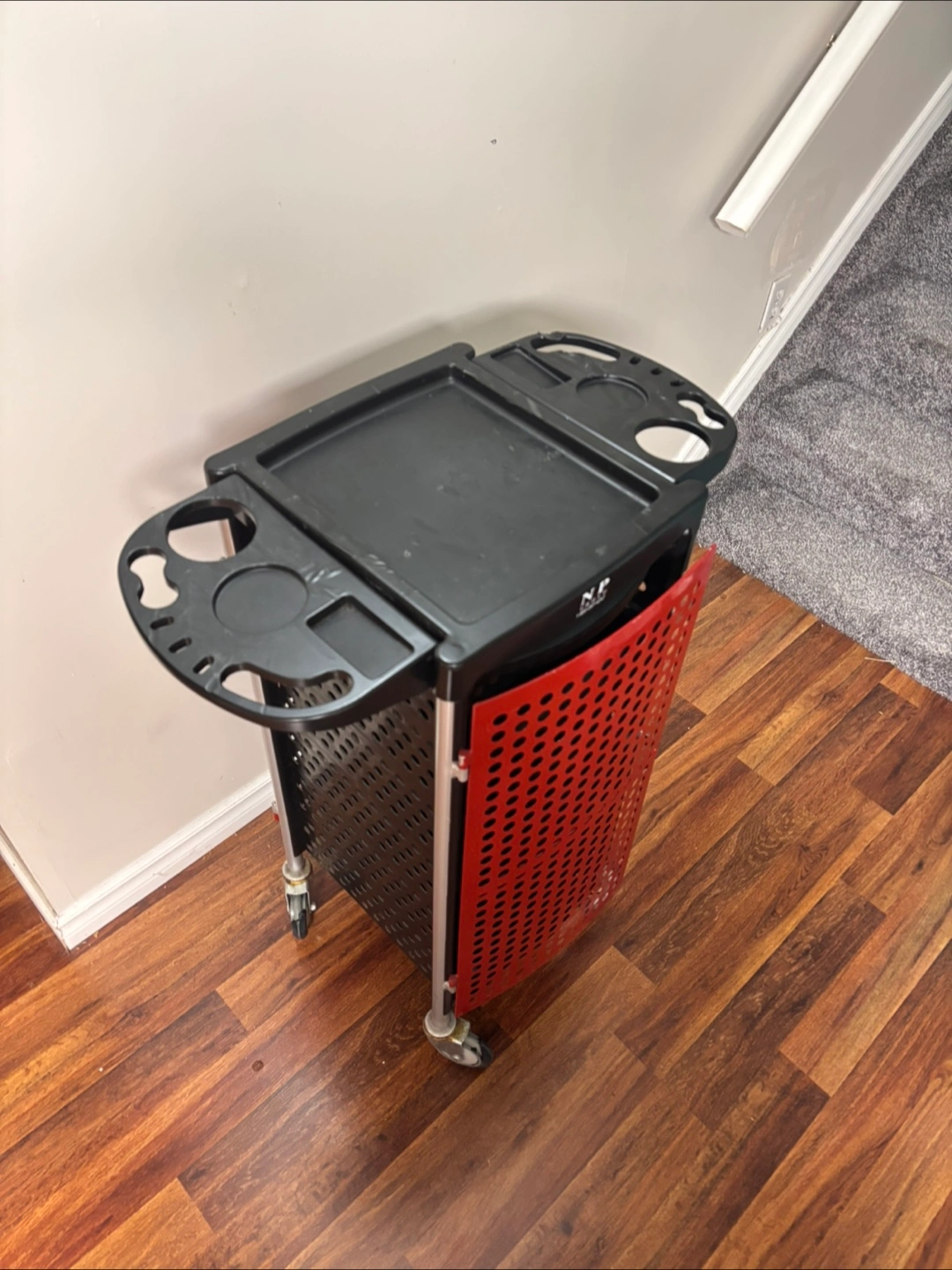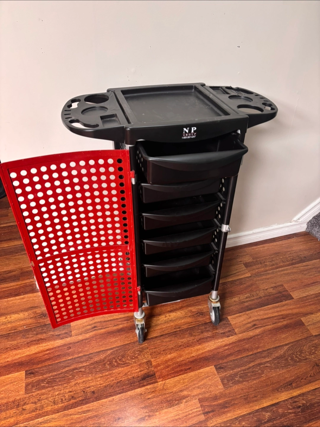 Black and red salon trolley. Five drawers. Top tray with various compartments. Rolling wheels. Red perforated side panel.