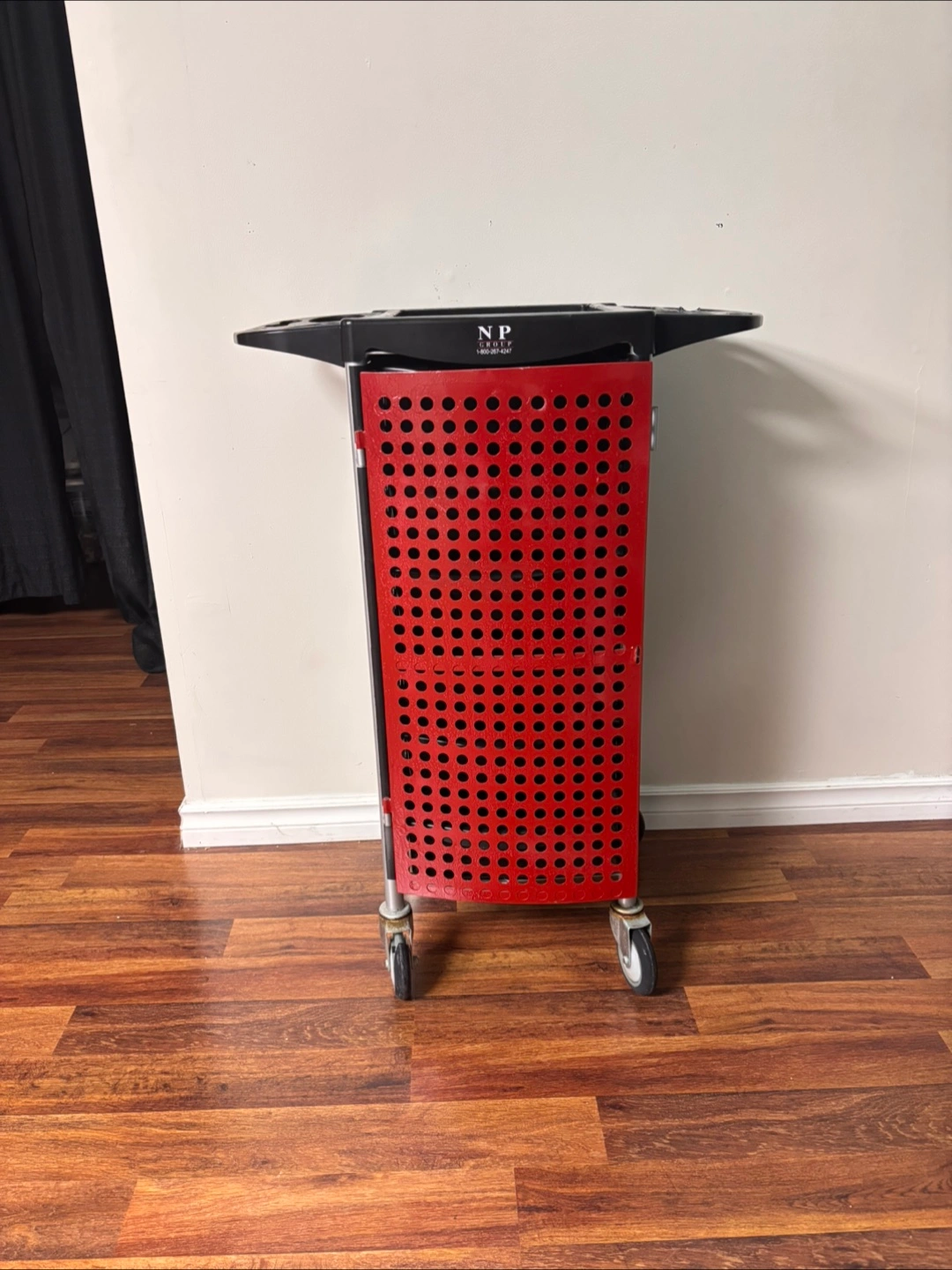 Black and red salon trolley. Five drawers. Top tray with various compartments. Rolling wheels. Red perforated side panel.