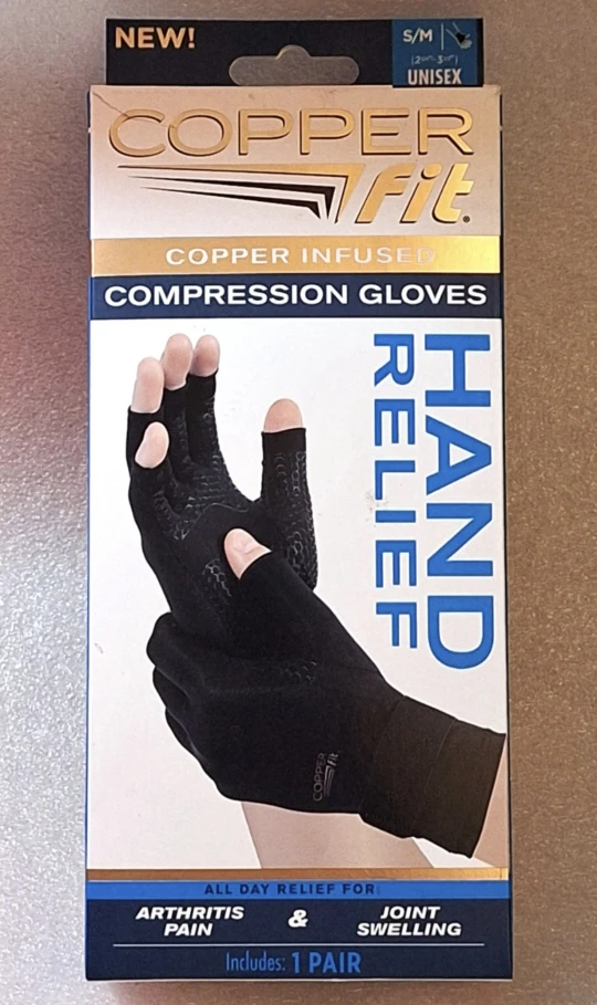 Selling a brand new pair of Copper Fit compression gloves in size S/M! These unisex gloves are designed for all-day relief from arthritis pain and joint swelling. They are copper infused and come in the original packaging