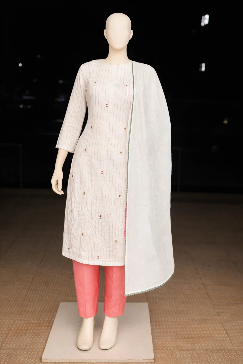 Selling a lovely kurti set! The kurti is white with subtle embroidery and stripes. It comes with a matching white dupatta and a pair of pink pants. Perfect for a casual or semi-formal occasion!