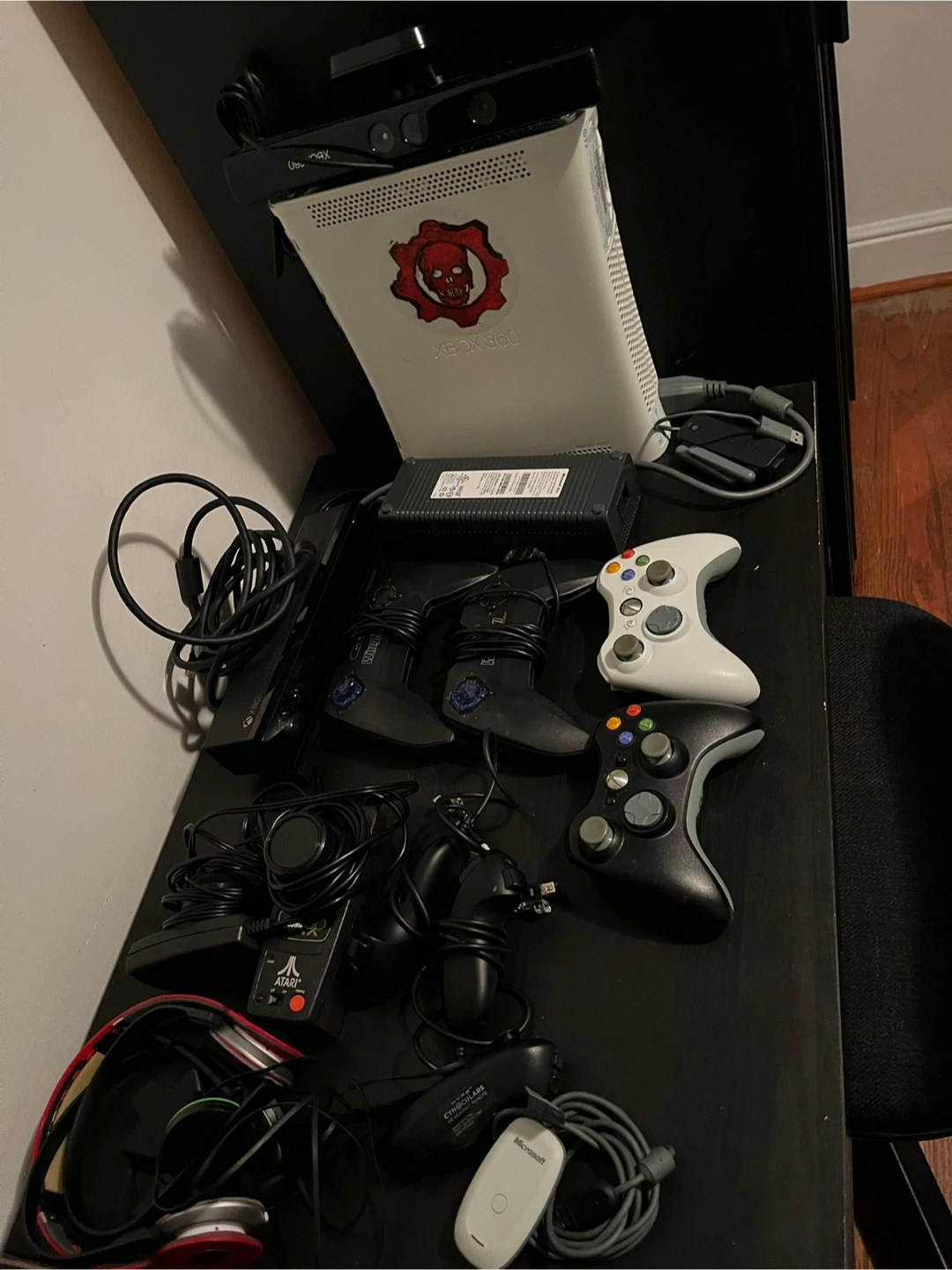 White Xbox 360 console with 2 controllers and various gaming accessories, including wired and wireless controllers, headsets, and other peripherals. Everything is in working condition.