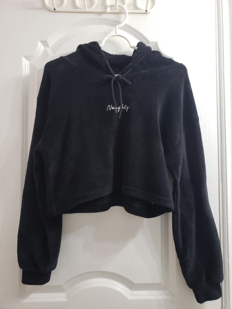 Black fuzzy cropped hoodie with drawstring detail and "Naughty" embroidered on the front. It's a size Large. Made in China.