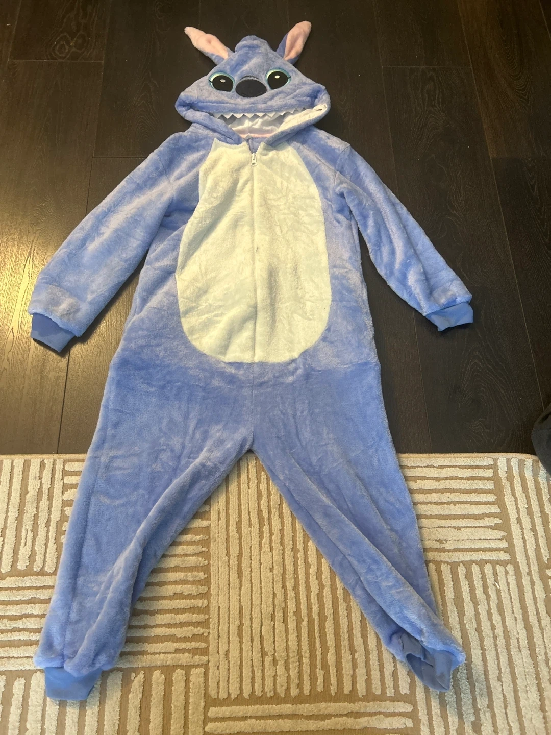 Super soft blue onesie pajamas designed to look like Stitch from Lilo & Stitch. It features a hood with Stitch's ears and face details. Perfect for lounging or costume fun! Used it for one Halloween.