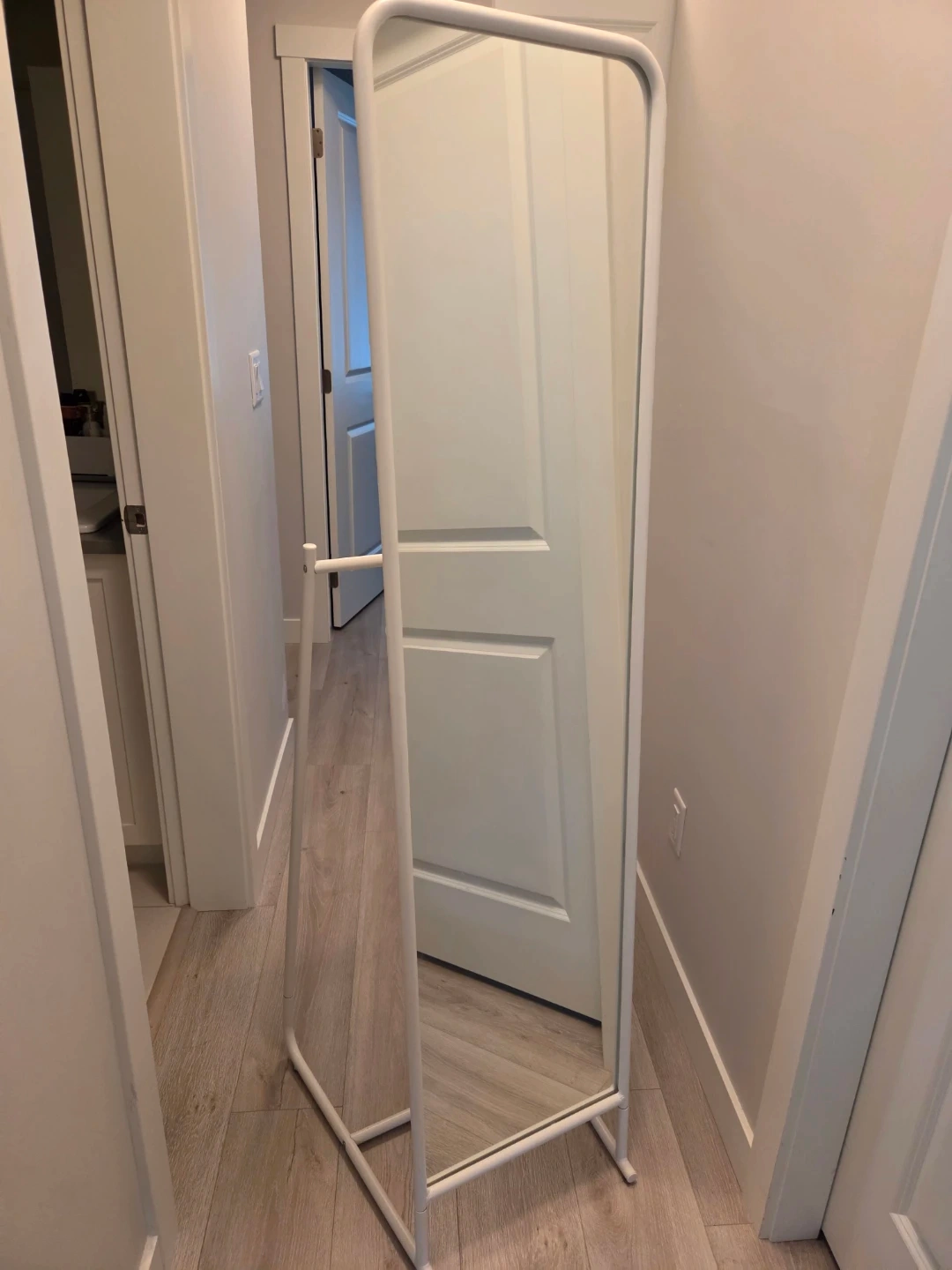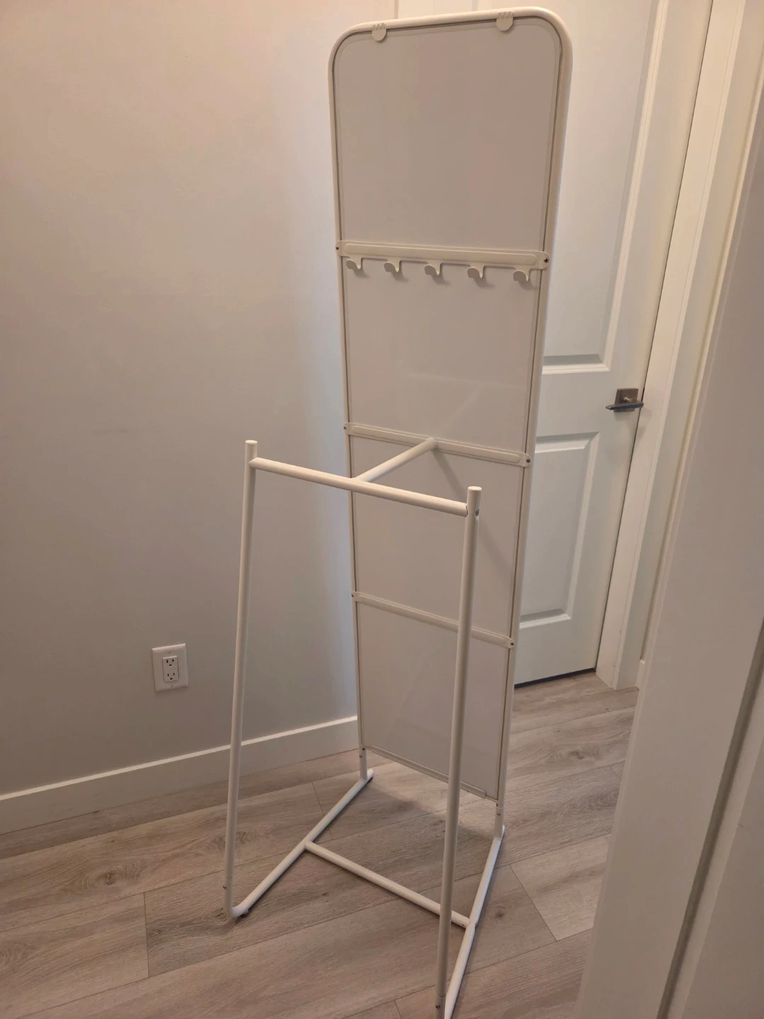 This white floor mirror has a slim metal frame and a convenient stand. It also features several hooks at the top for hanging items. It's great for bedrooms or entryways!