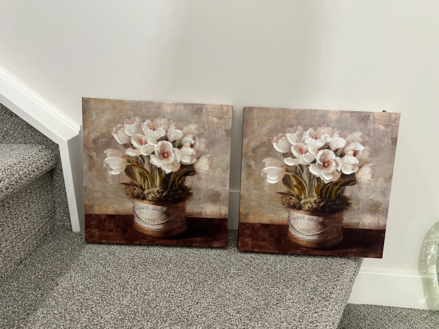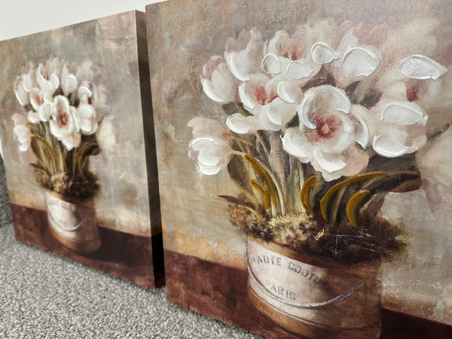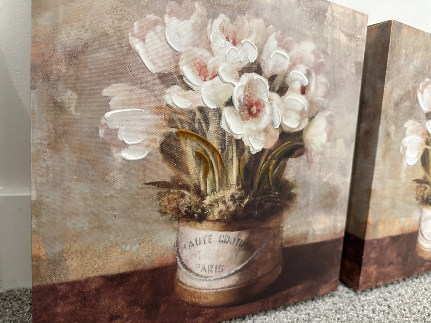 Set of two square canvases. Features a bouquet of white flowers in a tin container. Elegant, vintage-style artwork. Perfect for adding a touch of Parisian charm to your home.