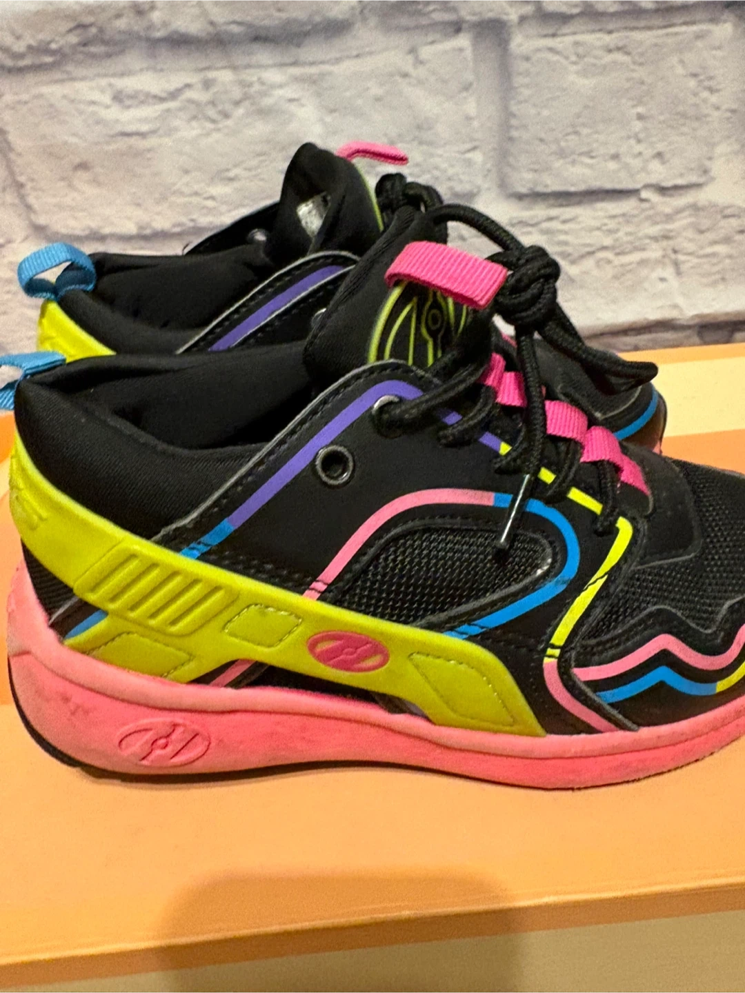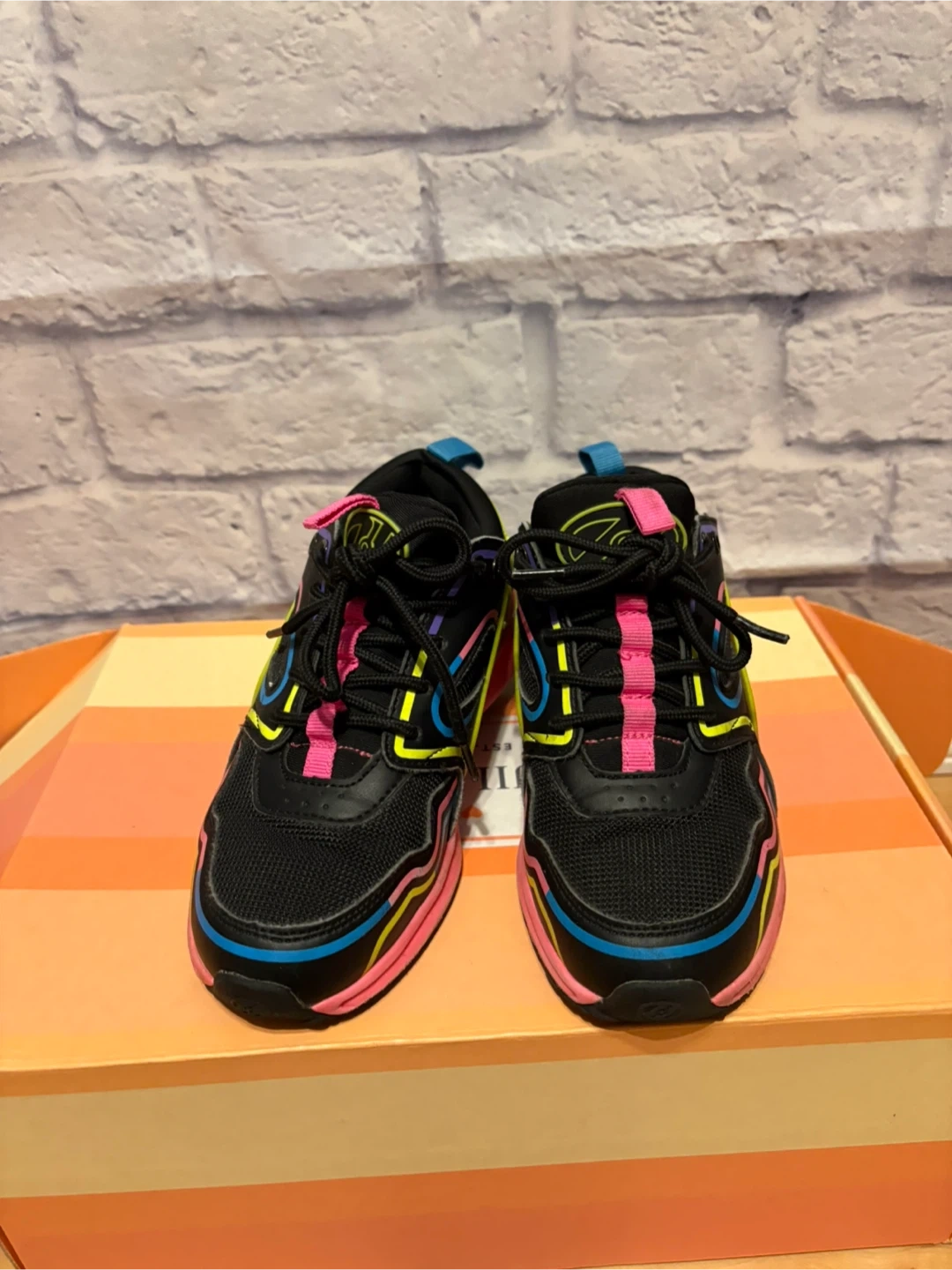 These are black Heelys roller shoes with pink, yellow, and blue accents. They feature removable wheels and lace-up closure. These are great for kids who want to skate and walk! Pick up only.