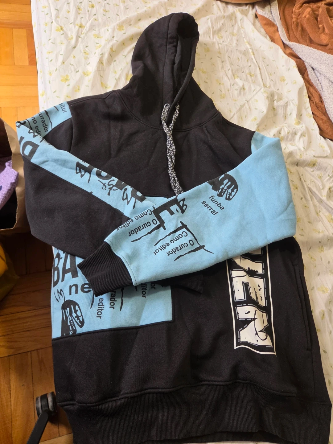 This is a black hoodie with light blue accents and graphic prints on the sleeves and front. It features a drawstring hood and ribbed cuffs and hem. The material is a comfortable cotton blend.