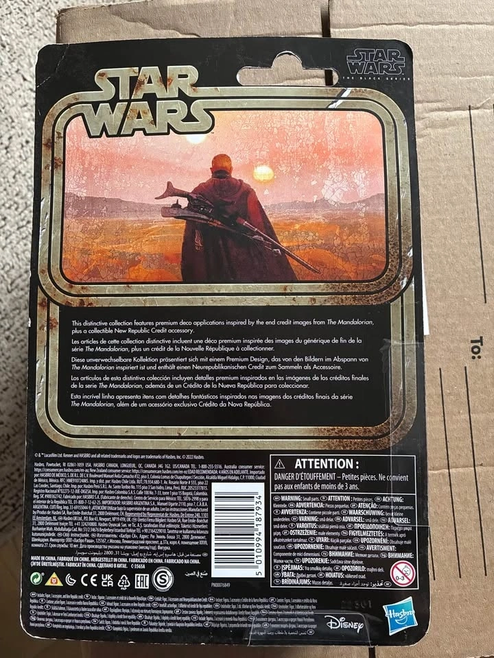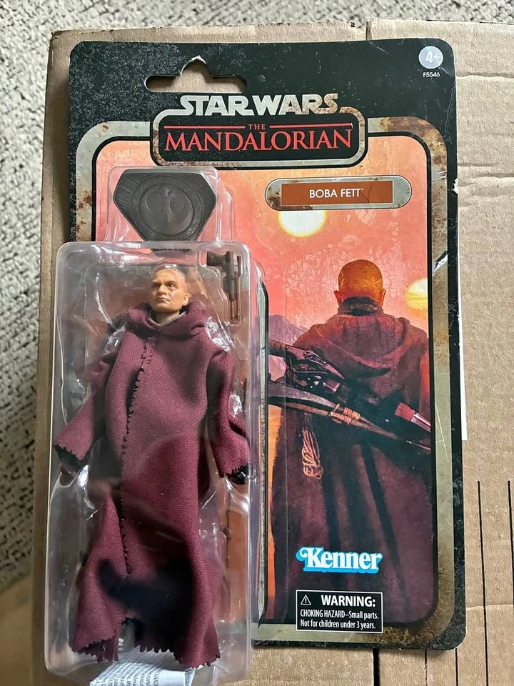 This is the Star Wars The Black Series Credit Collection Boba Fett action figure. It features Boba Fett in his Tusken Raider garb from The Mandalorian. It's a 6-inch scale action figure with premium articulation. Comes with accessories including a Tusken weapon and a special collectible currency credit. The packaging is vintage-inspired from the Kenner line. There's a minor crease on the top left corner of the packaging (see photo).