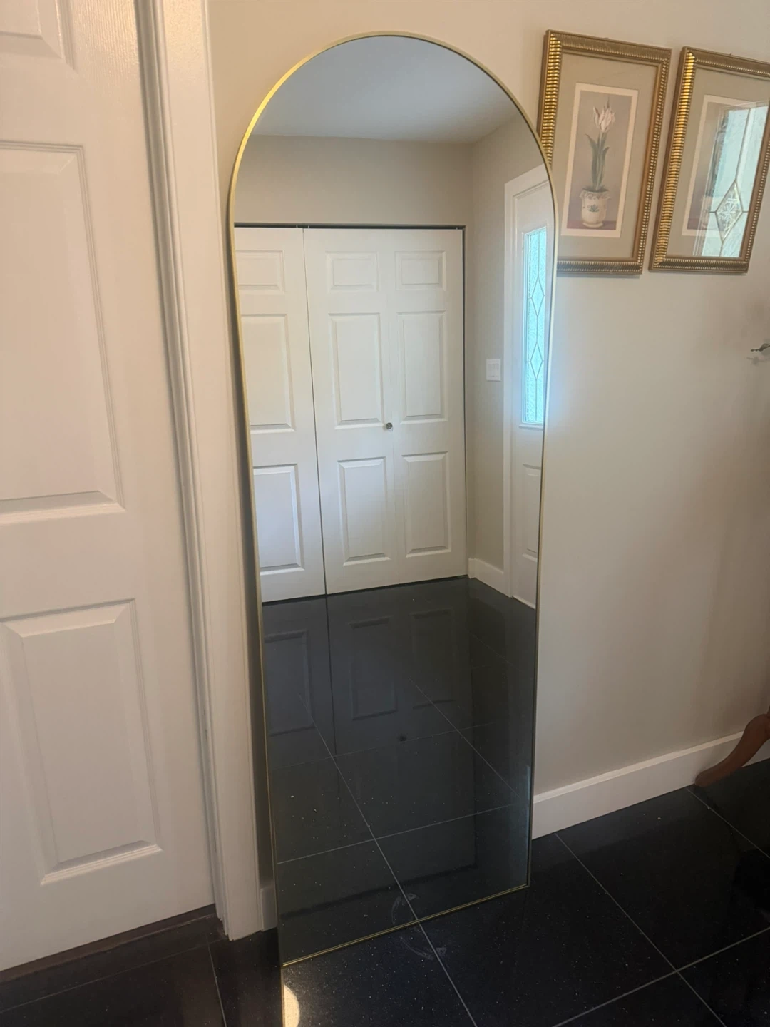 Brand new gold 71 inch x 26 inch floor mirror for sale. It has a kick stand in the back to help it lean and can be hung up on a wall as well; it comes with screws that are included: The trim is golden. Great for living rooms, bedrooms, and entryways. Message me if you are interested.