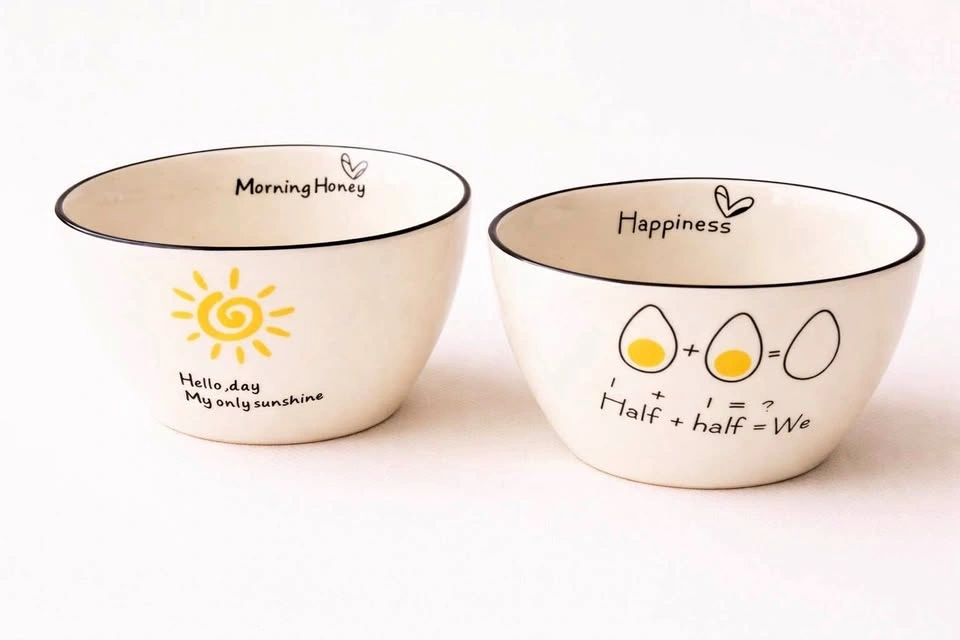 A charming off-white ceramic bowl designed with delicate hand-drawn illustrations and soft, uplifting quotes. Finished with a thin black rim, each bowl features playful side prints that add character while keeping the overall look minimal and modern.