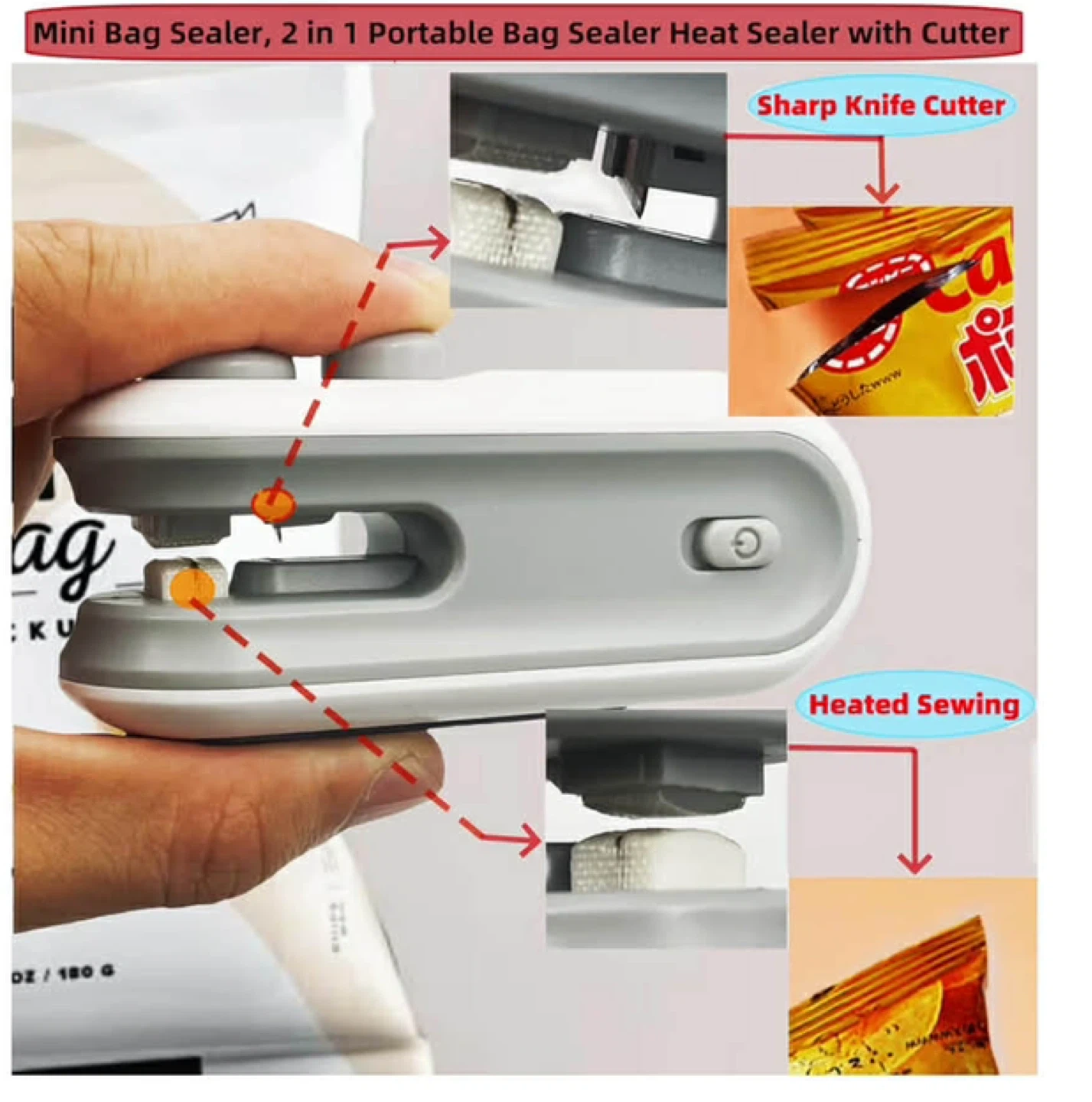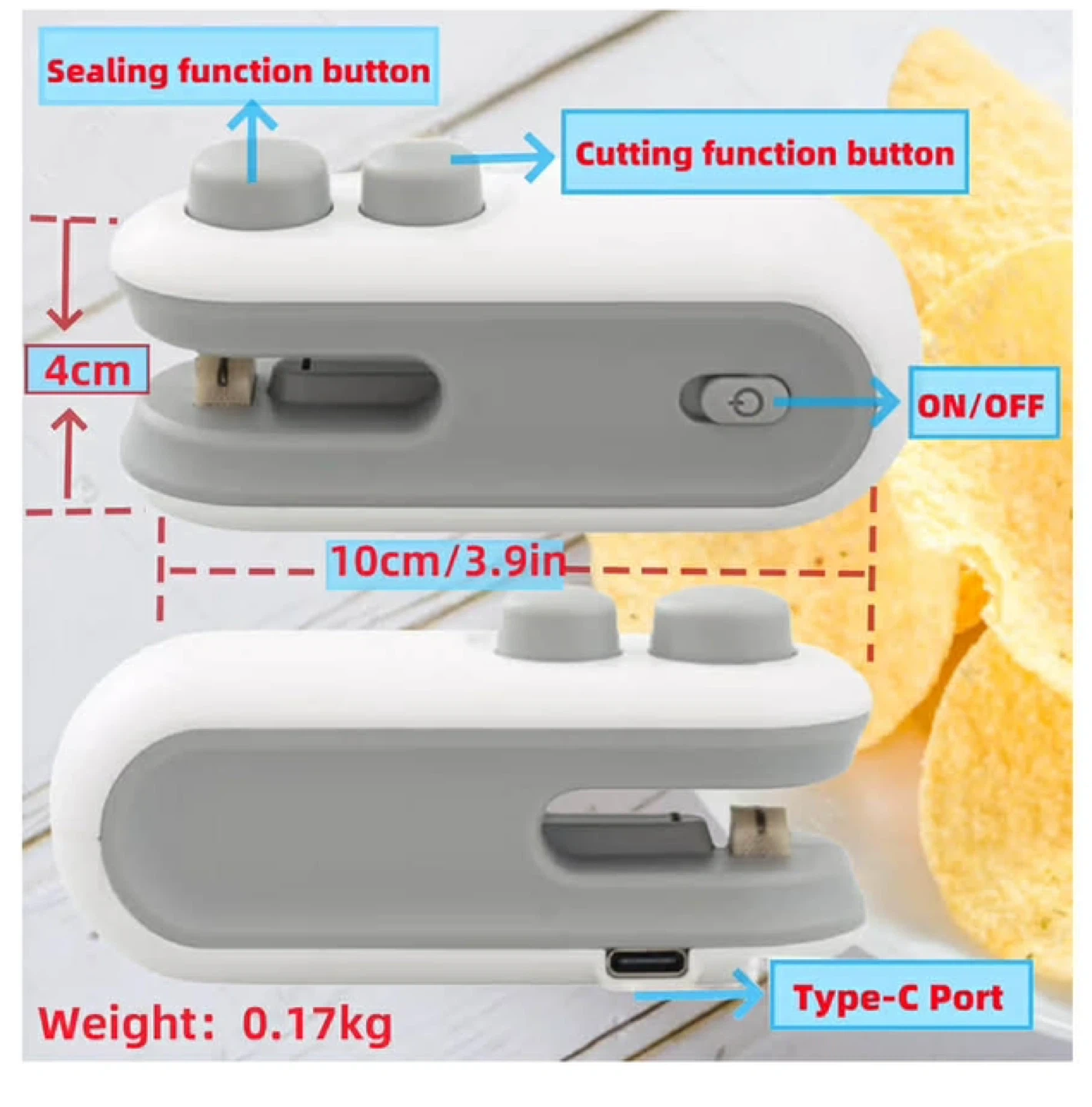 This portable bag sealer is a handy 2-in-1 tool for sealing and cutting food bags. It features a sharp knife cutter and a heated sewing function. The device measures approximately 9cm x 3.5cm x 4cm and charges via a Type-C port. Keep snacks fresh and organized!