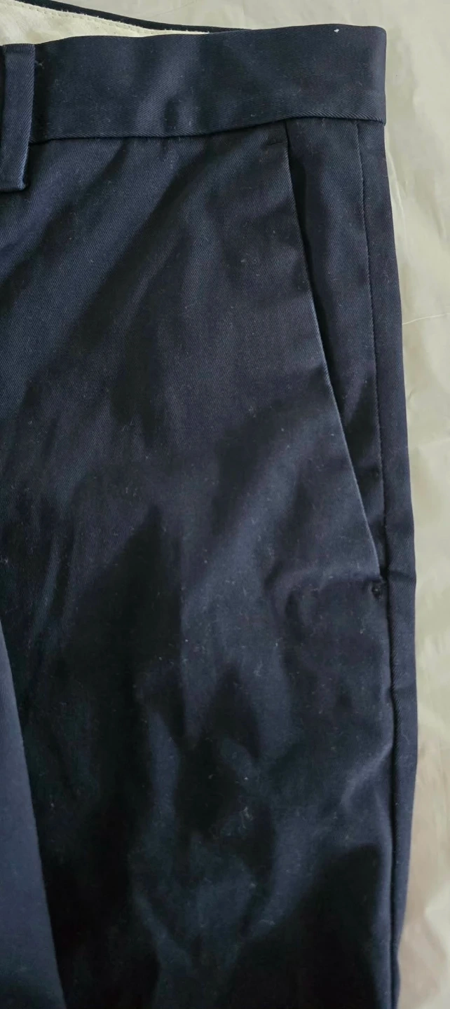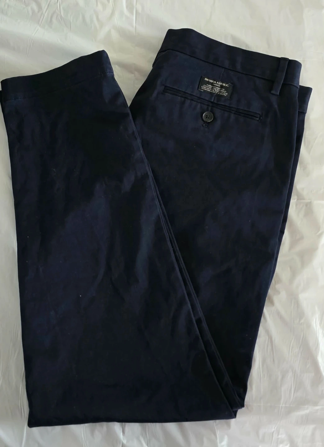 Navy chinos from Banana Republic. These pants are a size 33x30. They're made of a cotton blend for comfort. These trousers are great for dressing up or down!