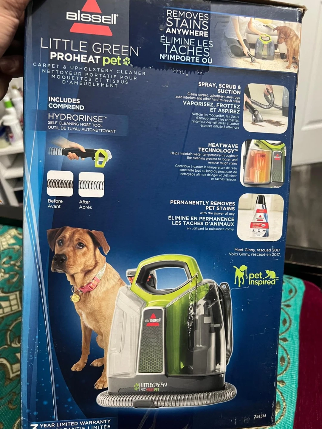 This Bissell Little Green ProHeat Pet carpet and upholstery cleaner is designed for tough stains. It includes a 3" Tough Stain Tool, HydroRinse self-cleaning hose, and a 8oz formula bottle. It's great for pet owners who need to tackle accidents and messes. This unit features heatwave technology to help maintain water temperature throughout the cleaning process.