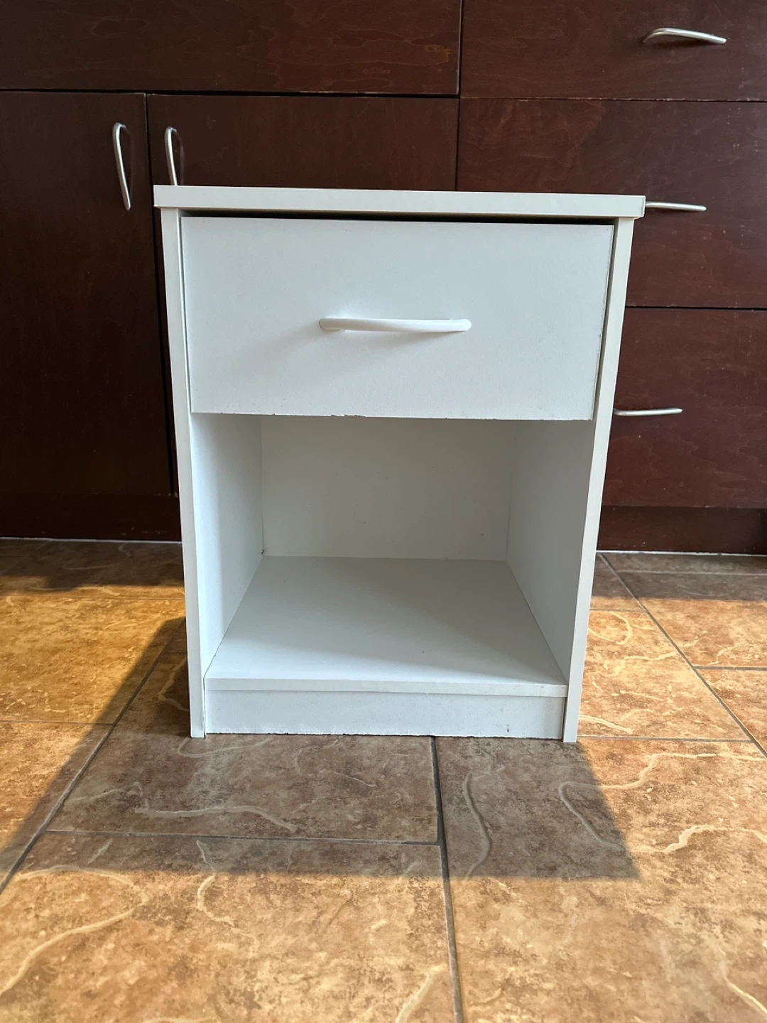Selling a cute little white bedside table! It has a drawer for storage and an open shelf below. Perfect for keeping your nighttime essentials close by
