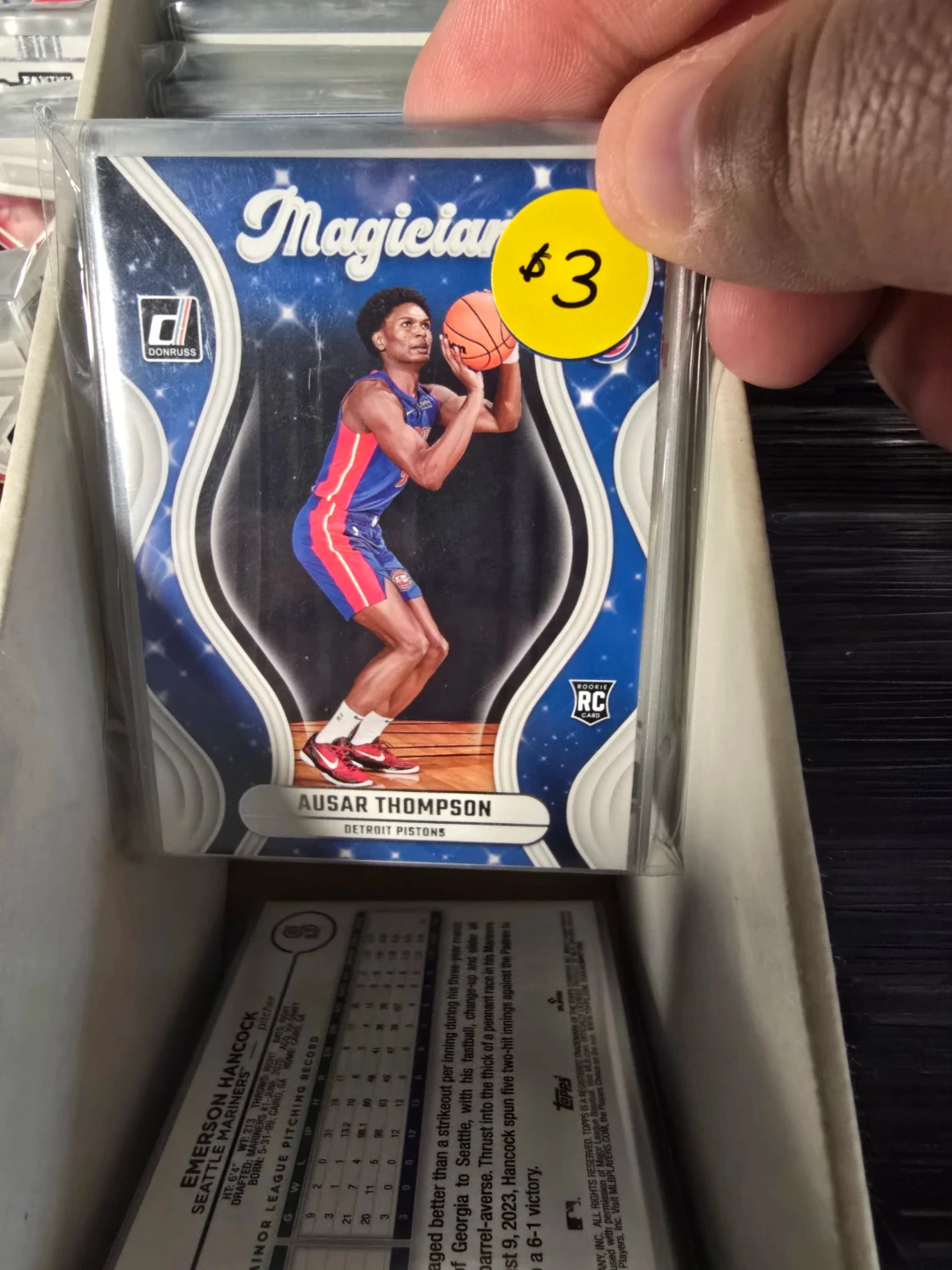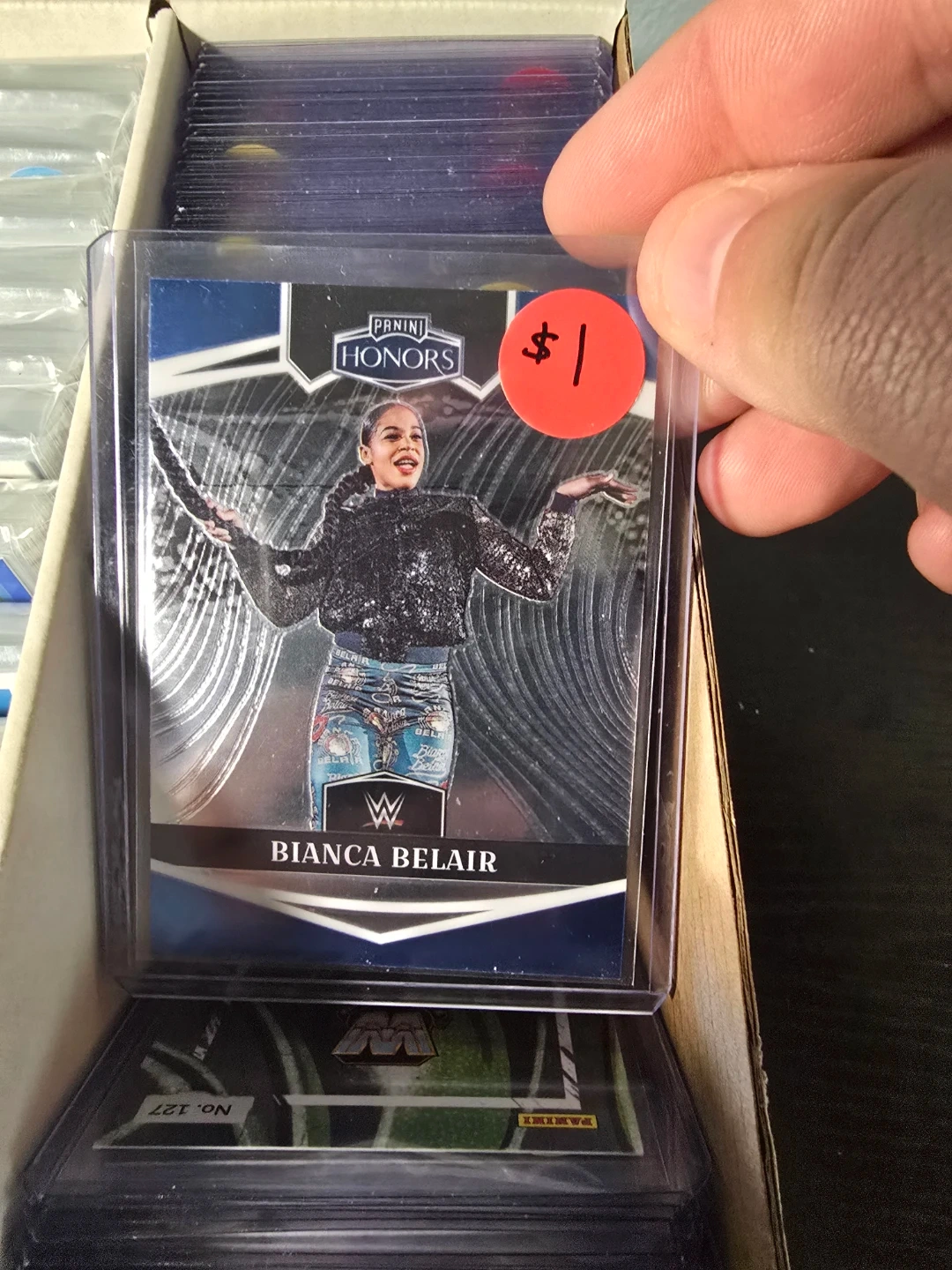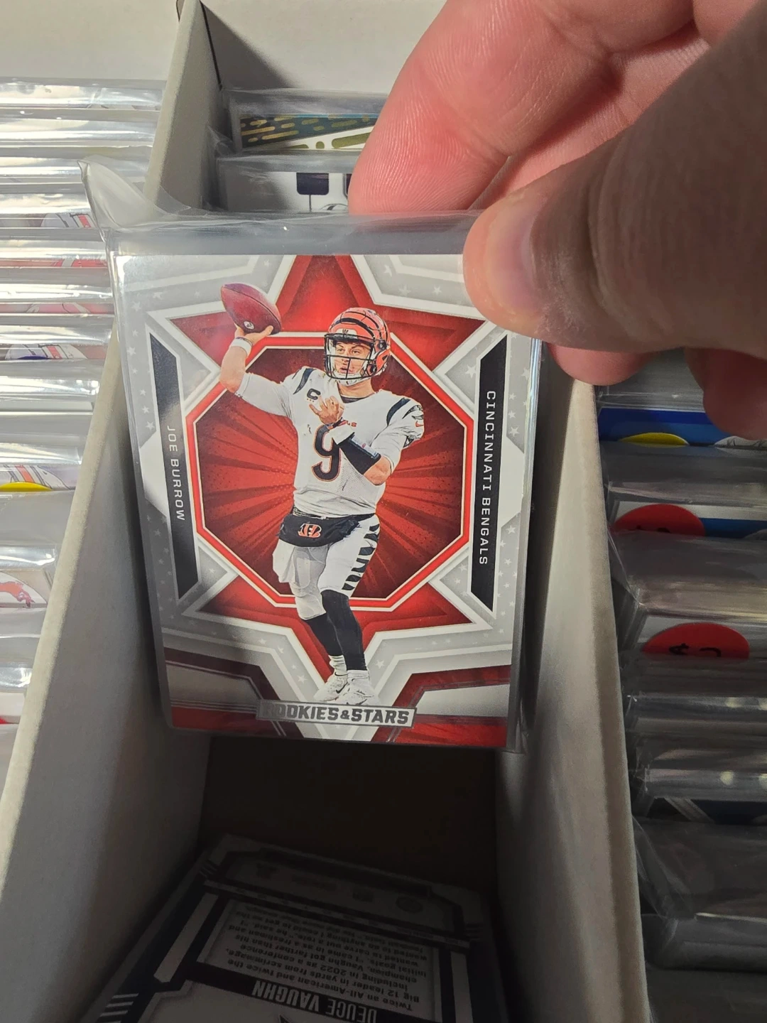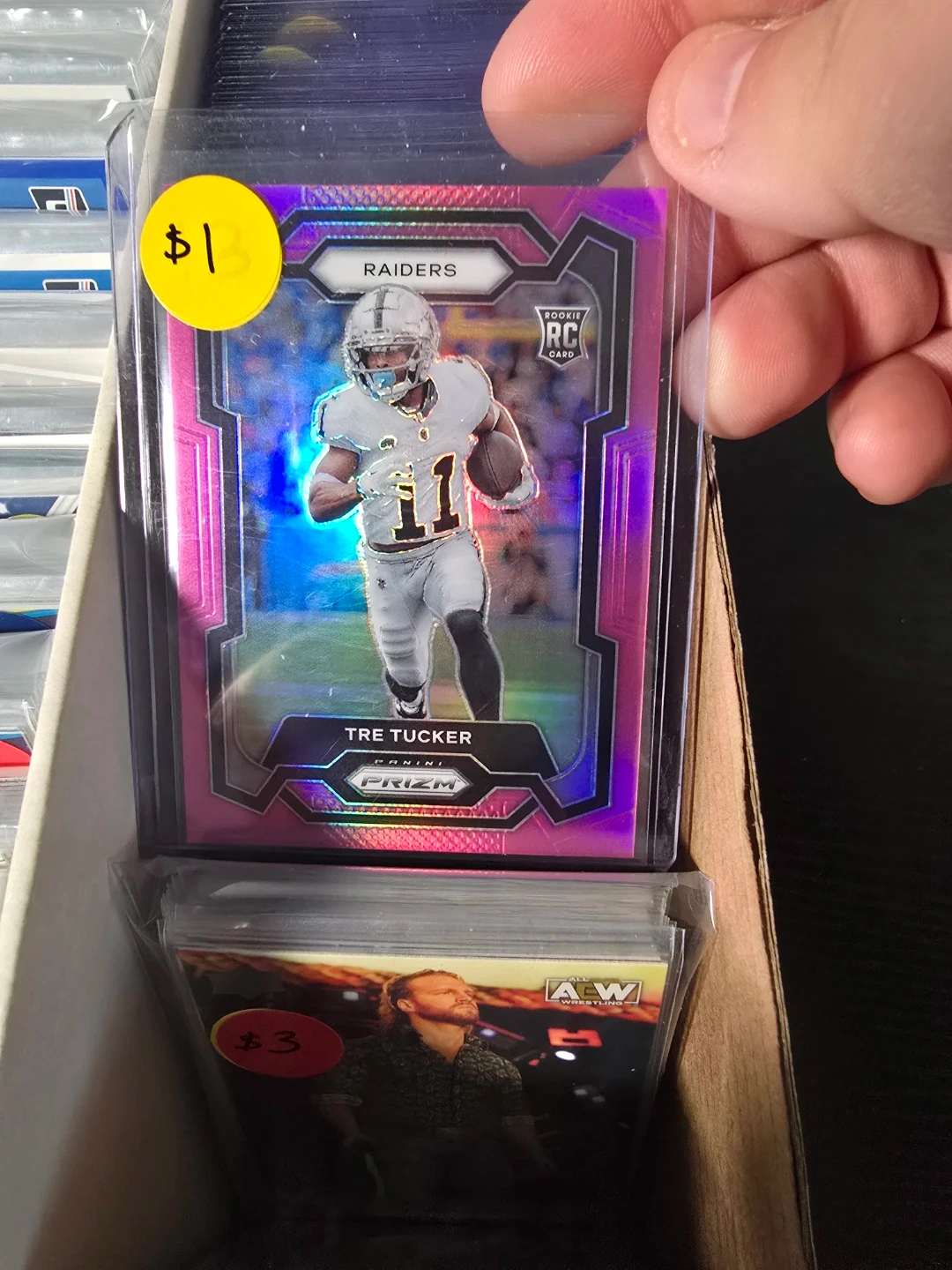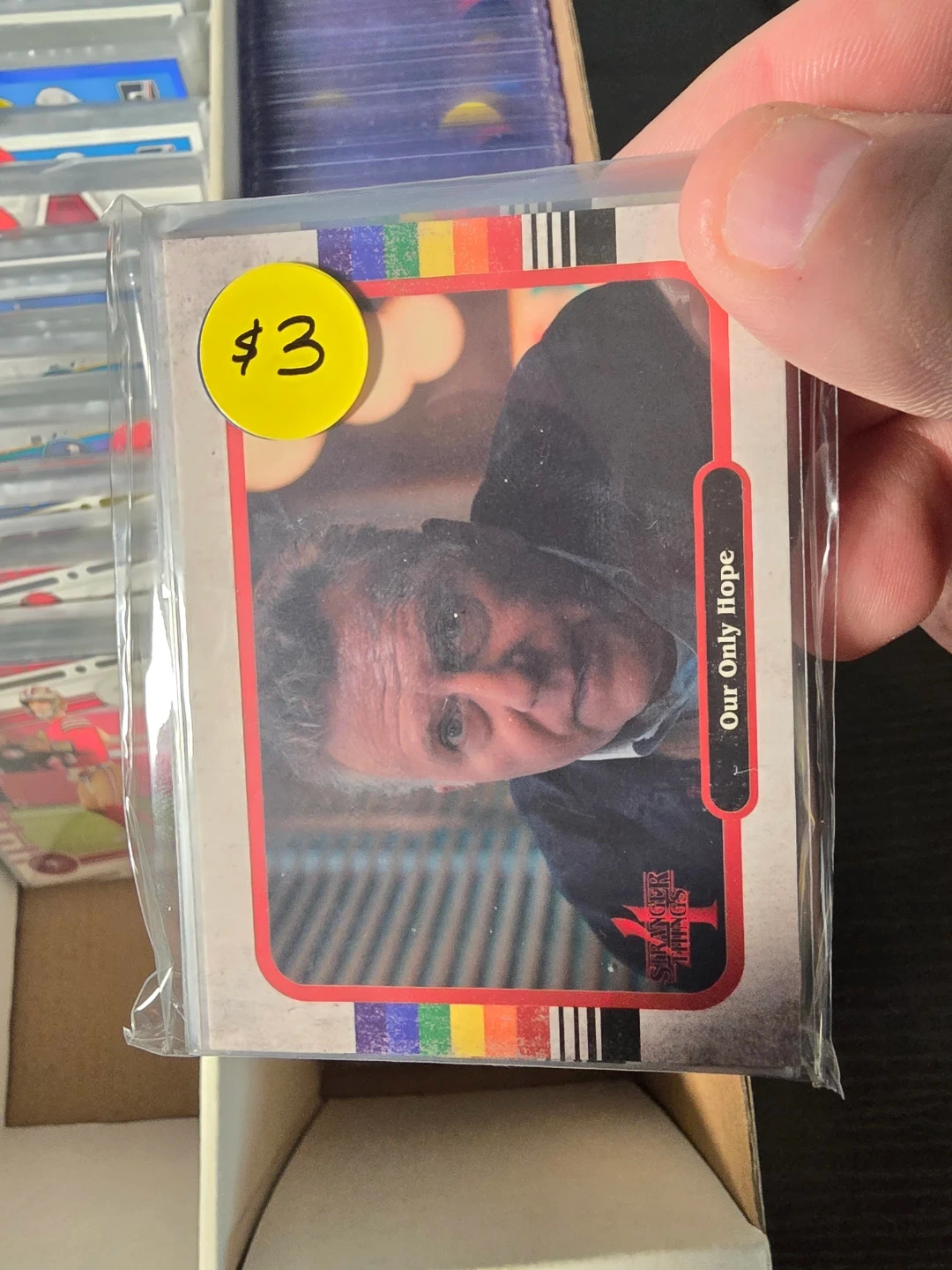 This is a collection of various sports trading cards, including football and possibly other sports. There are even stranger things trading cards as well. Cards are sleeved and organized in a storage box. Some cards have price stickers indicating $1 - $3.