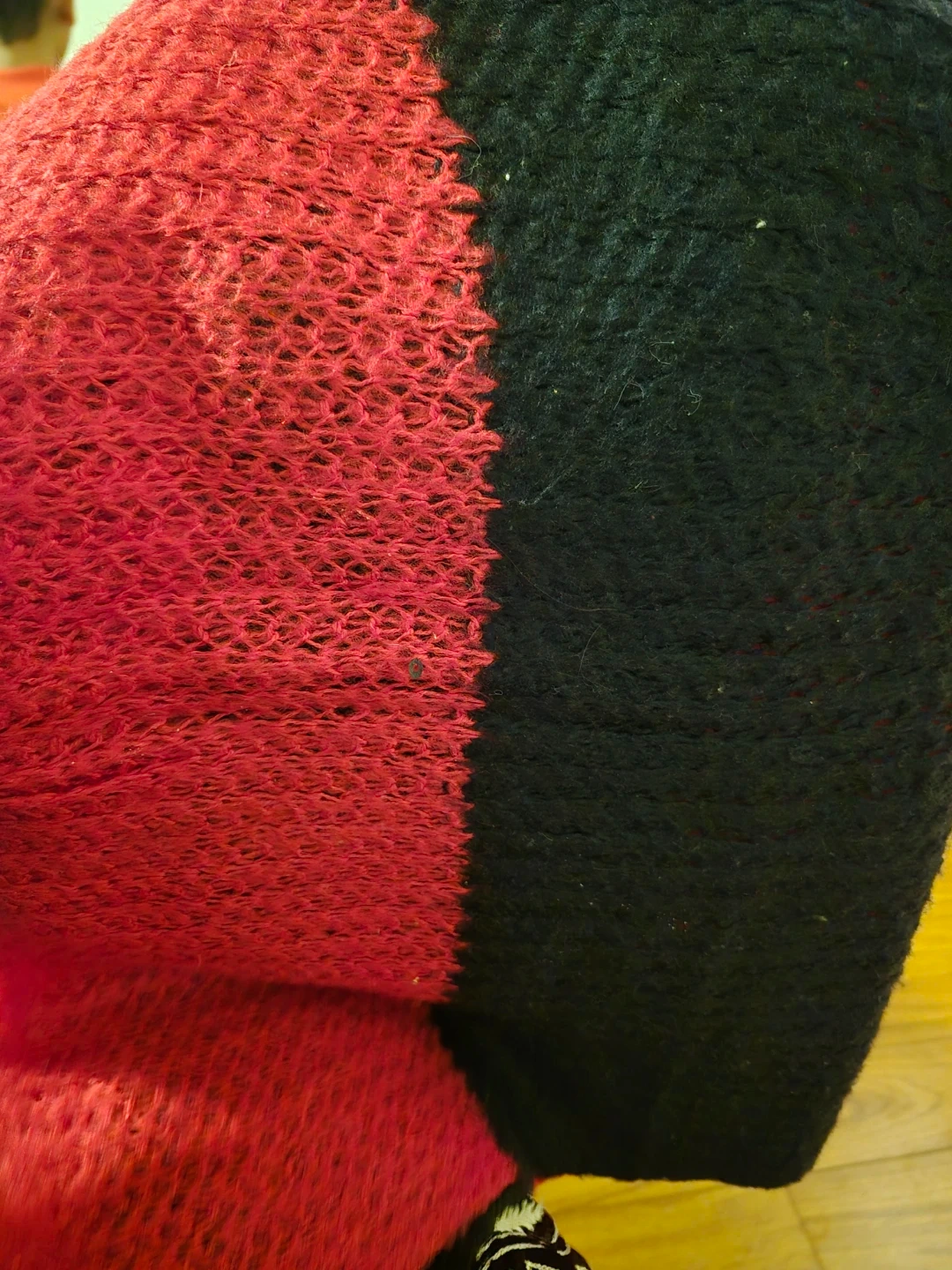 Here's a cozy knit throw scarf in a striking red and black colour combination! It's perfect for adding a pop of colour and warmth in winter . The knit texture adds a lovely touch of comfort and style. It's in great condition and ready to be enjoyed!