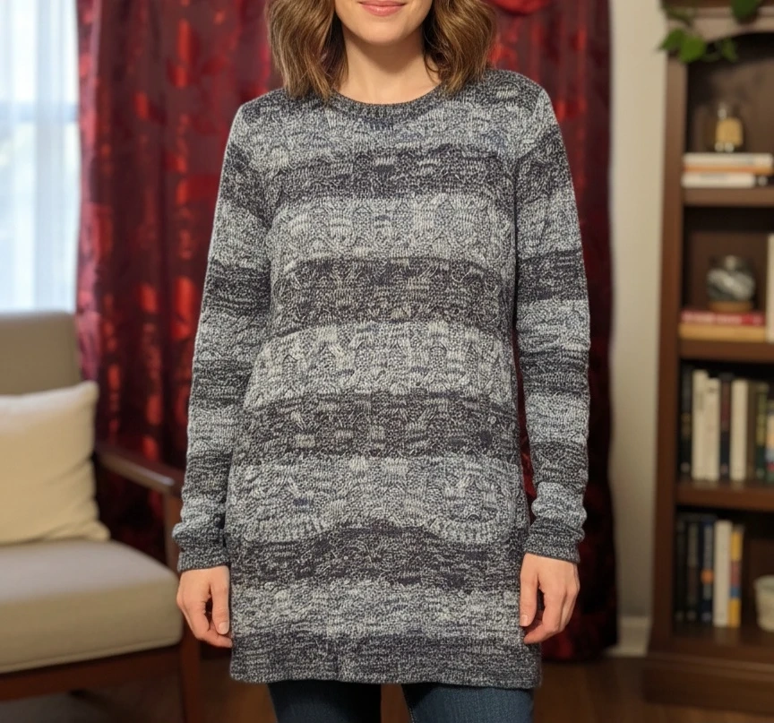 This Eight Eight Eight sweater features a marled blue and gray striped pattern with cable knit detailing. It's made from 100% cotton and is a size medium. This top offers a comfortable and casual look.