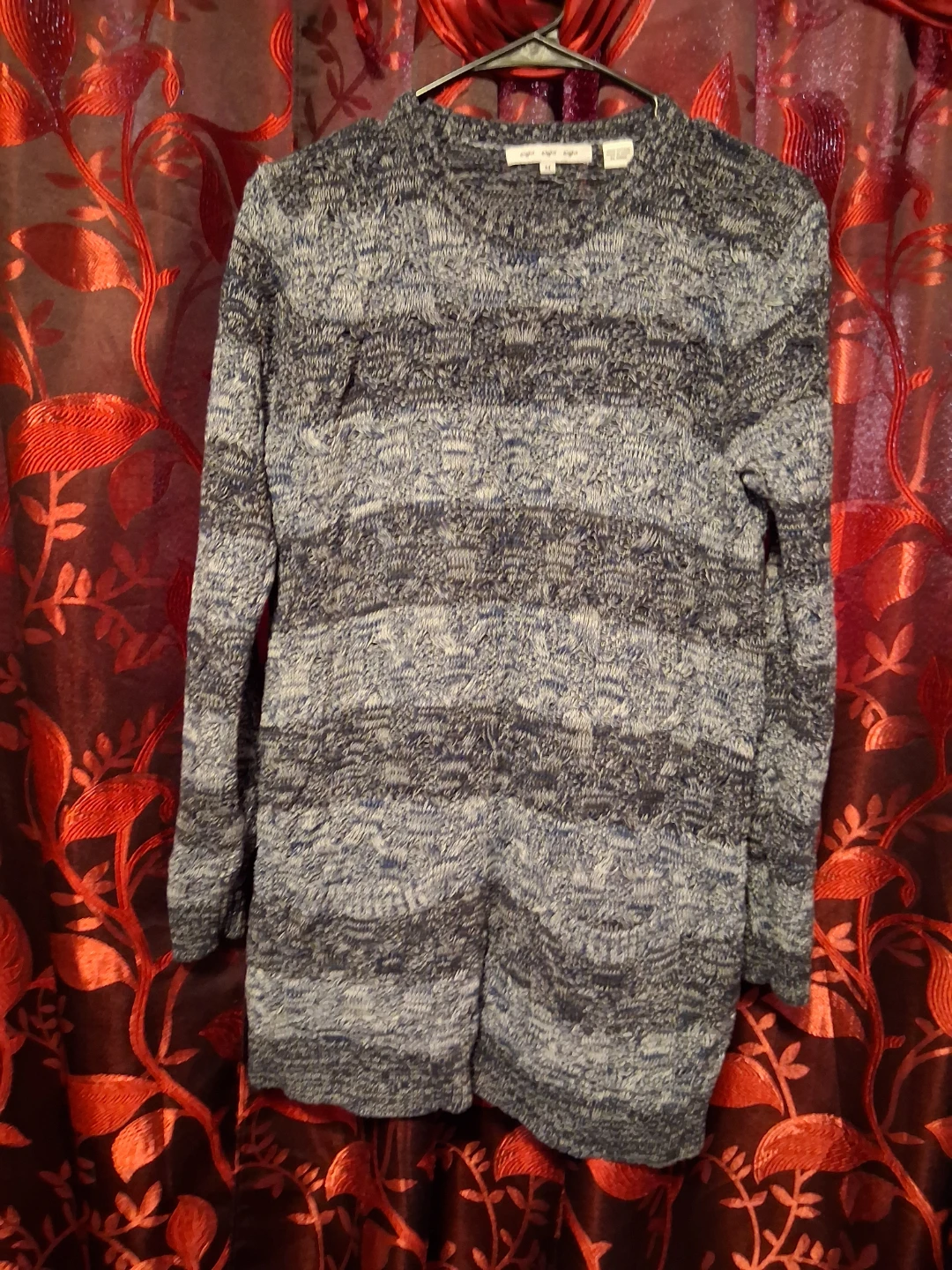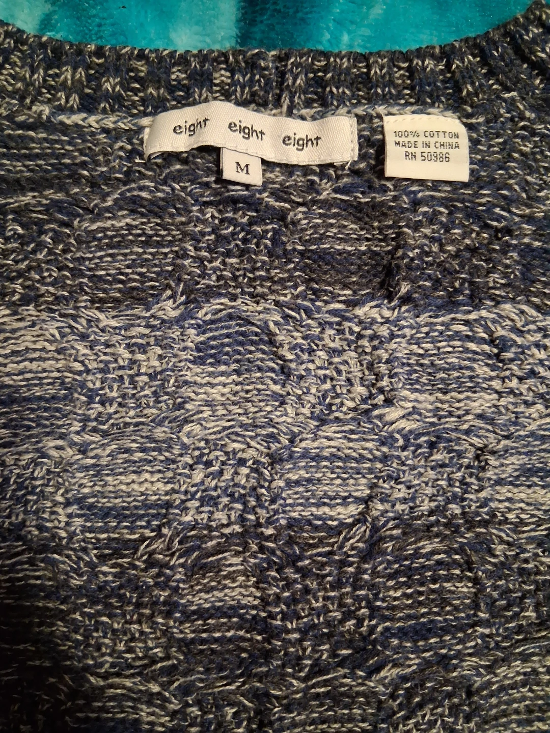 This Eight Eight Eight sweater features a marled blue and gray striped pattern with cable knit detailing. It's made from 100% cotton and is a size medium. This top offers a comfortable and casual look.