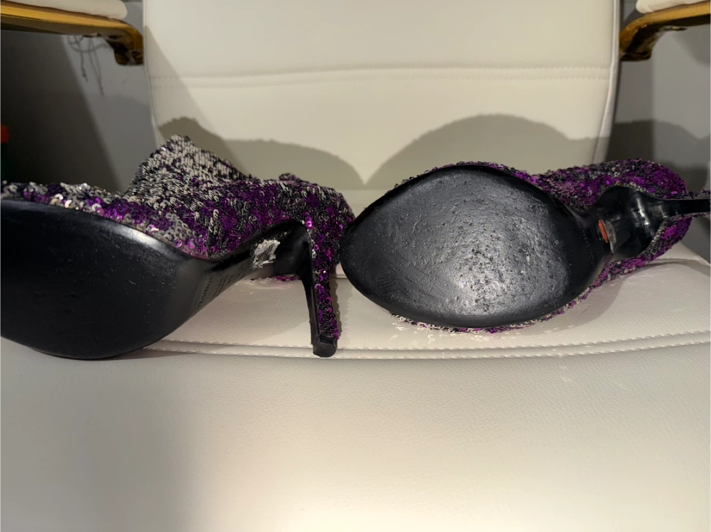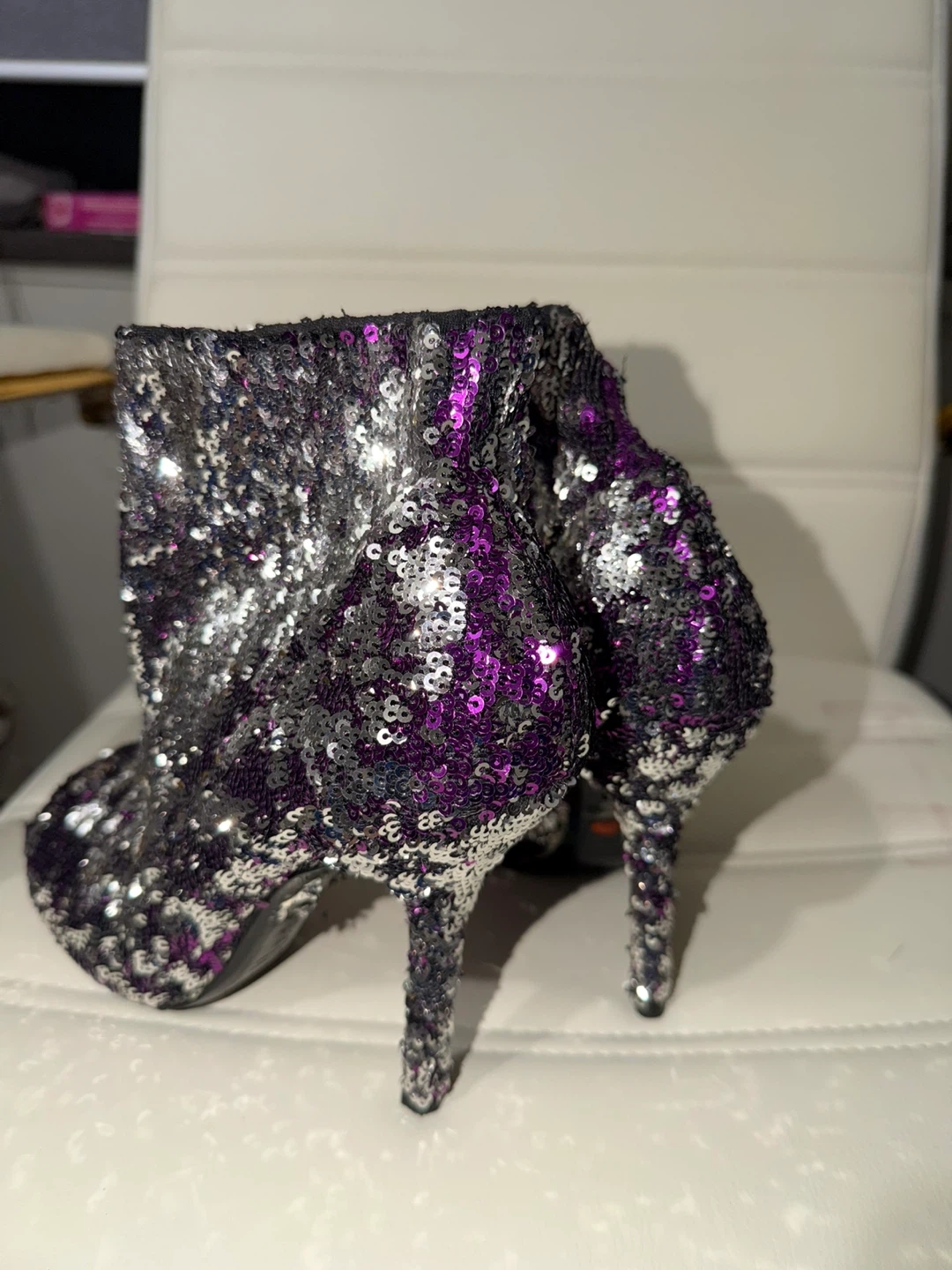 Sparkling booties covered in purple and silver sequins. Features a peep-toe design and stiletto heel. Perfect for a night out or special occasion!