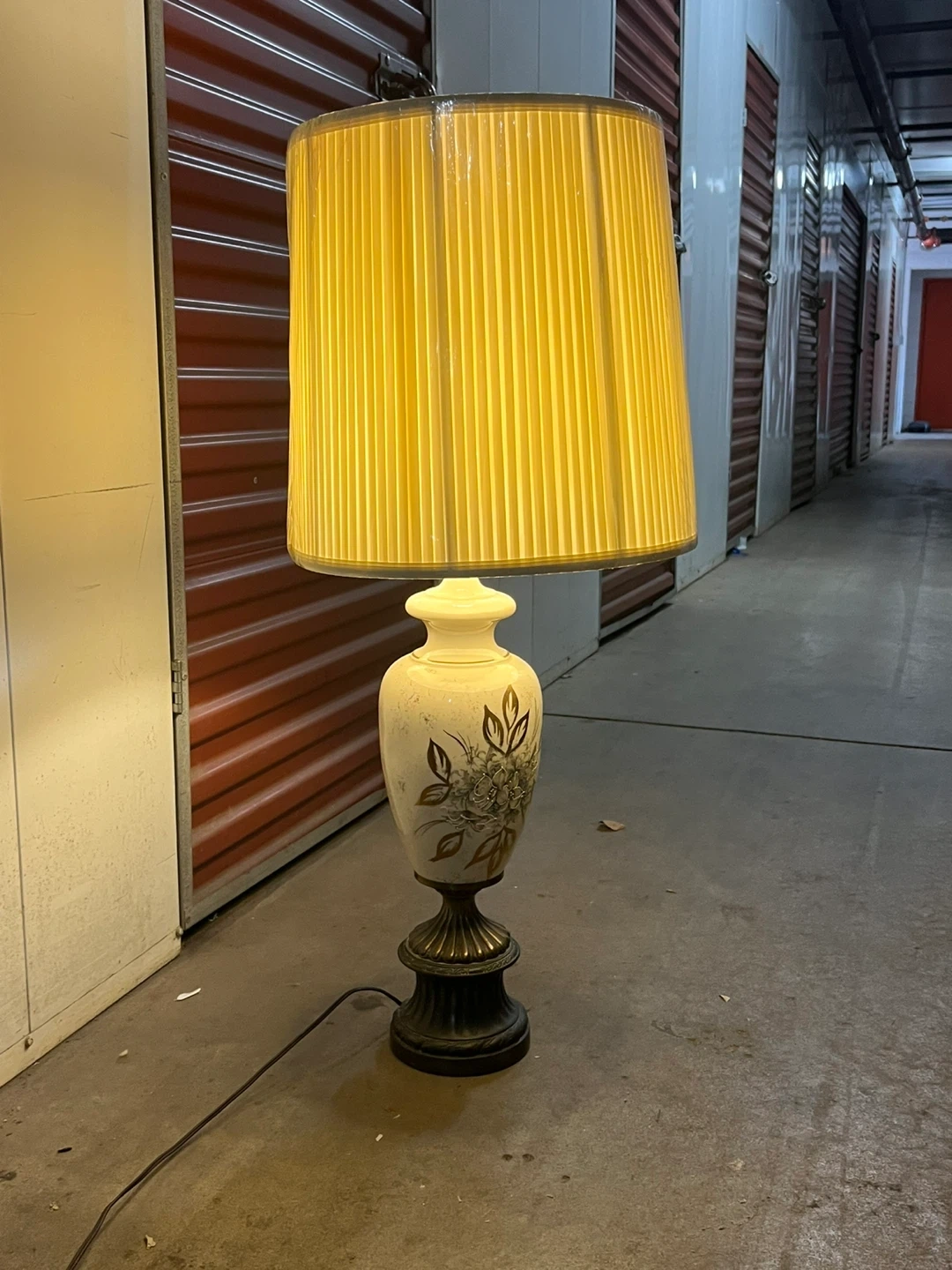 This is a vintage table lamp featuring a cream-colored ceramic base with a floral design. It has a dark metal pedestal and a yellow pleated fabric shade. It's a classic piece that adds a warm glow to any room!
