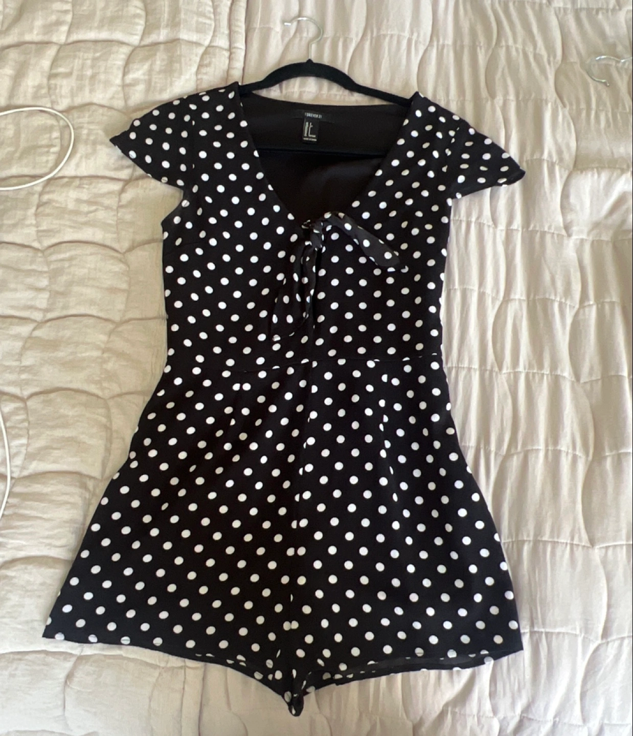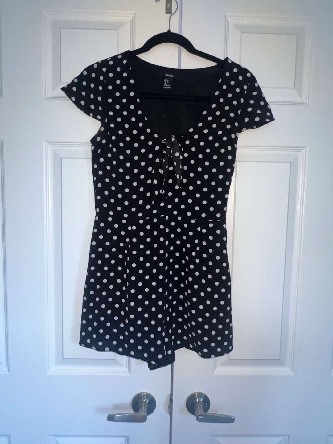 Cute Forever 21 romper with a black and white polka dot pattern. It's a size small and in great condition! Perfect for a casual day out or a fun summer event.
