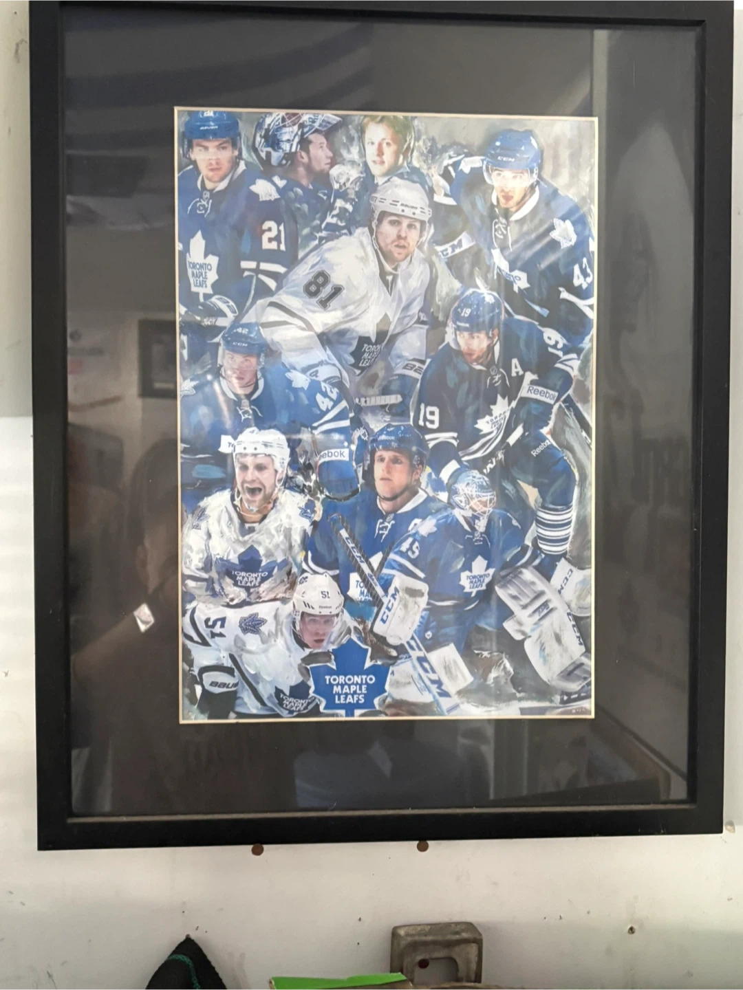 Framed artwork featuring multiple Toronto Maple Leafs players. Includes jerseys with numbers like 81, 21, 19, 51, and 43. A great piece for any hockey fan!