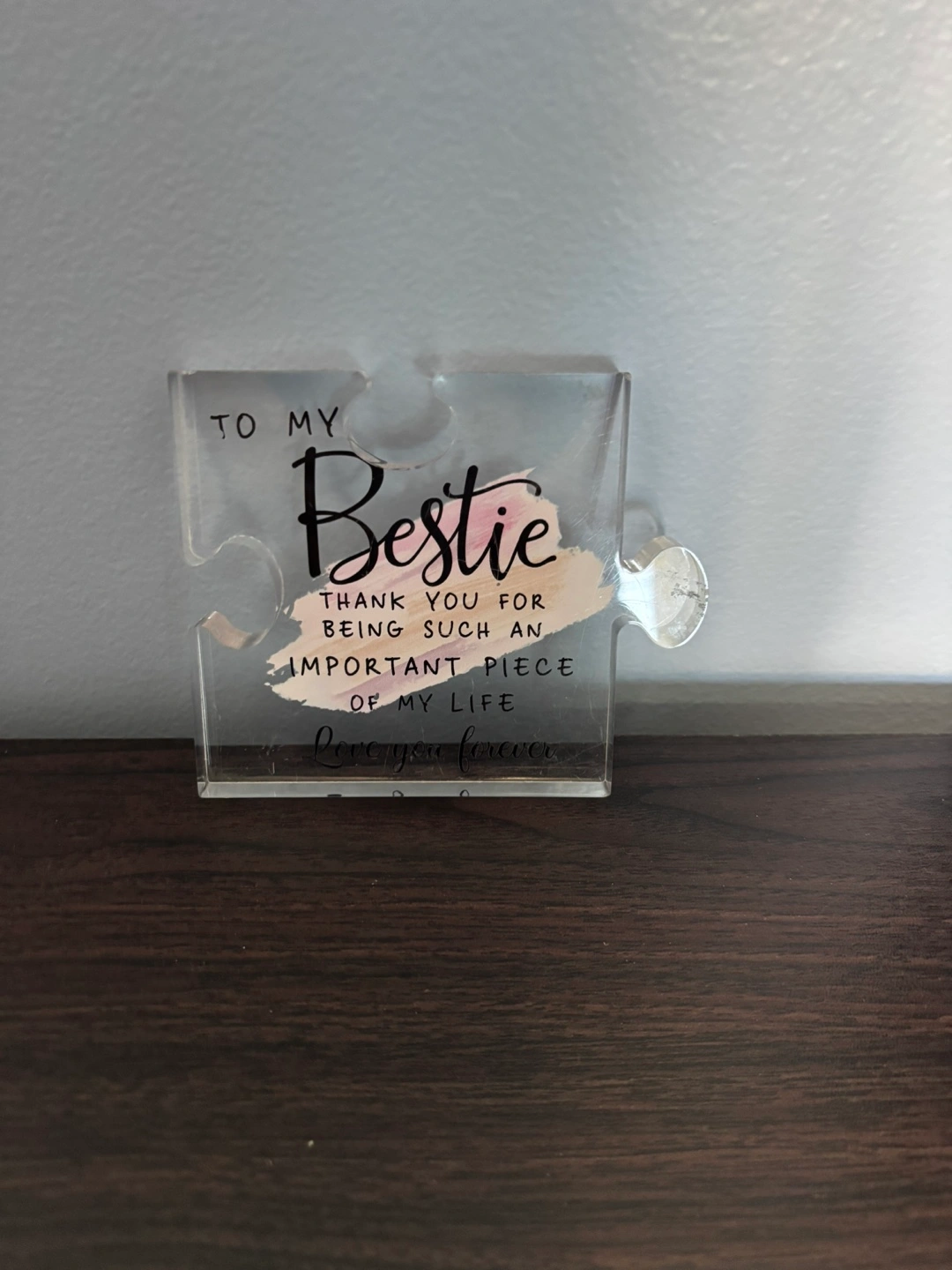 Puzzle piece with a heartwarming message. Perfect for a desk or nightstand to display to a loved one, helping create a sense of calm. Clear acrylic with black script and a splash of pink.