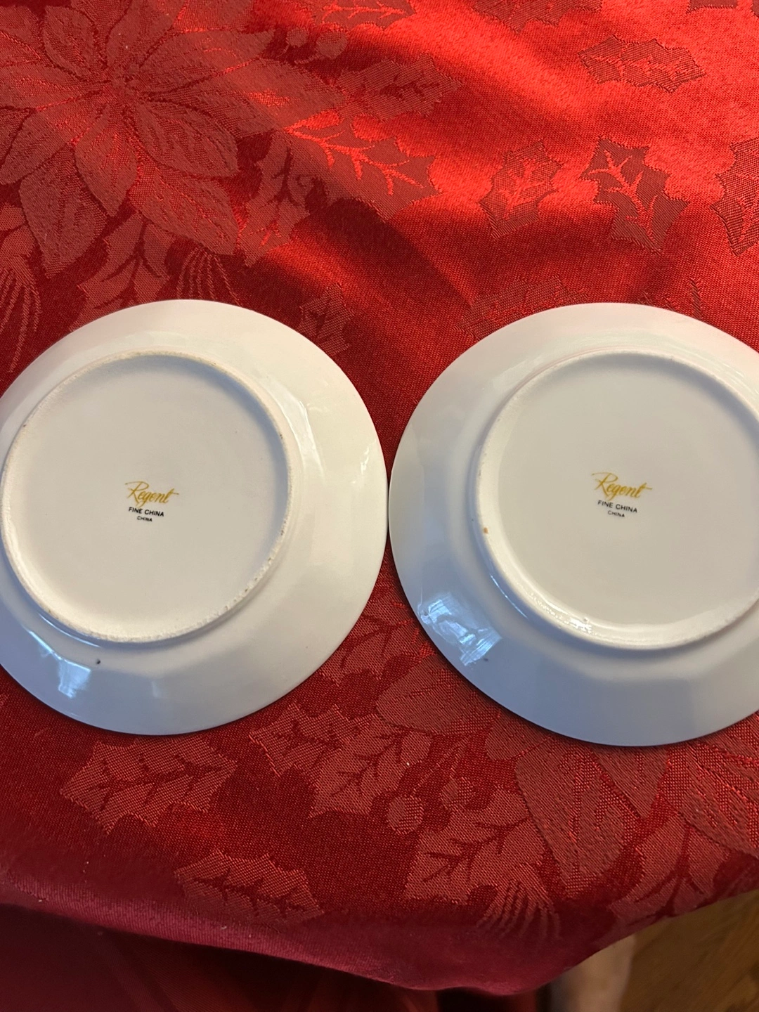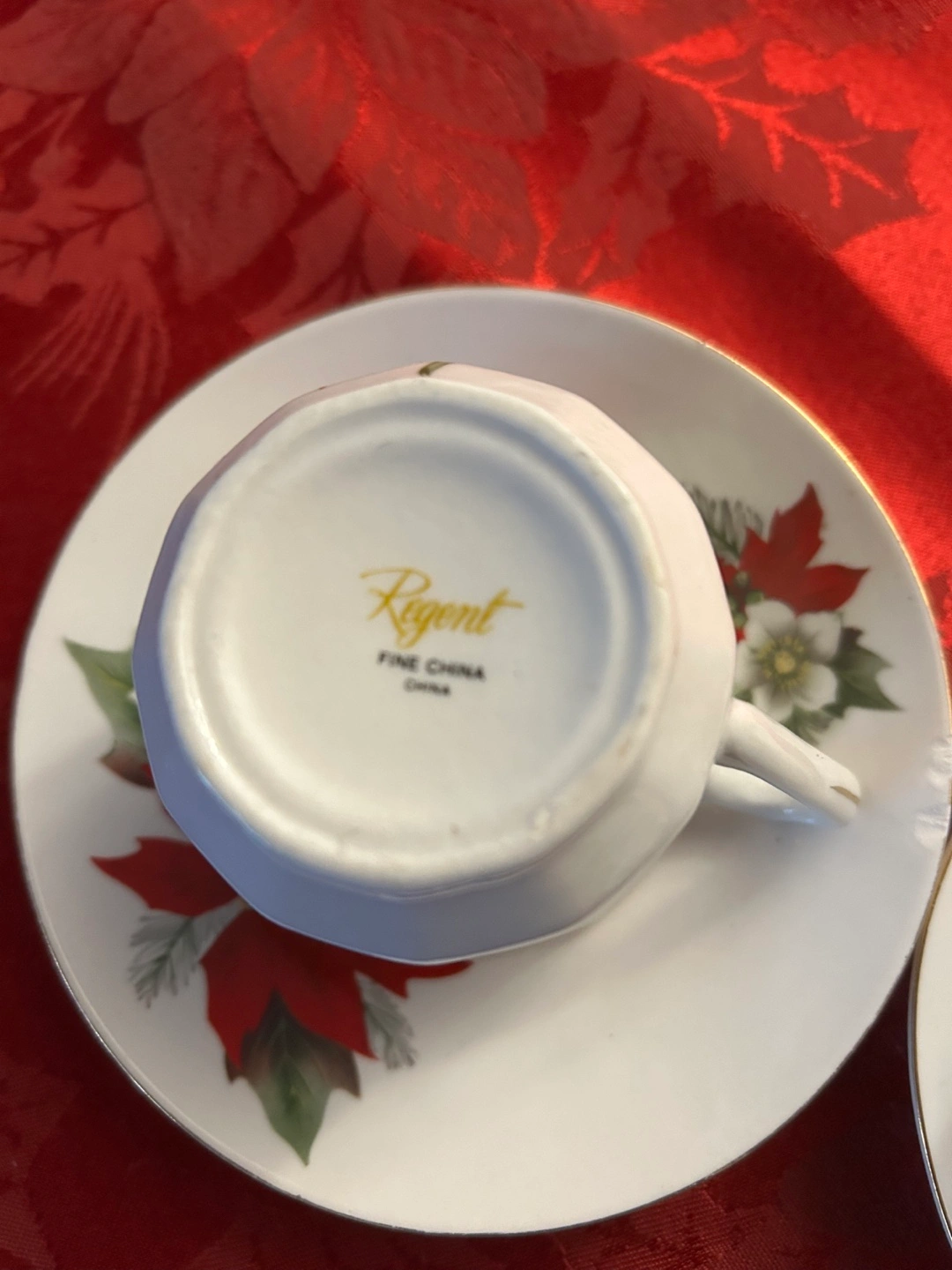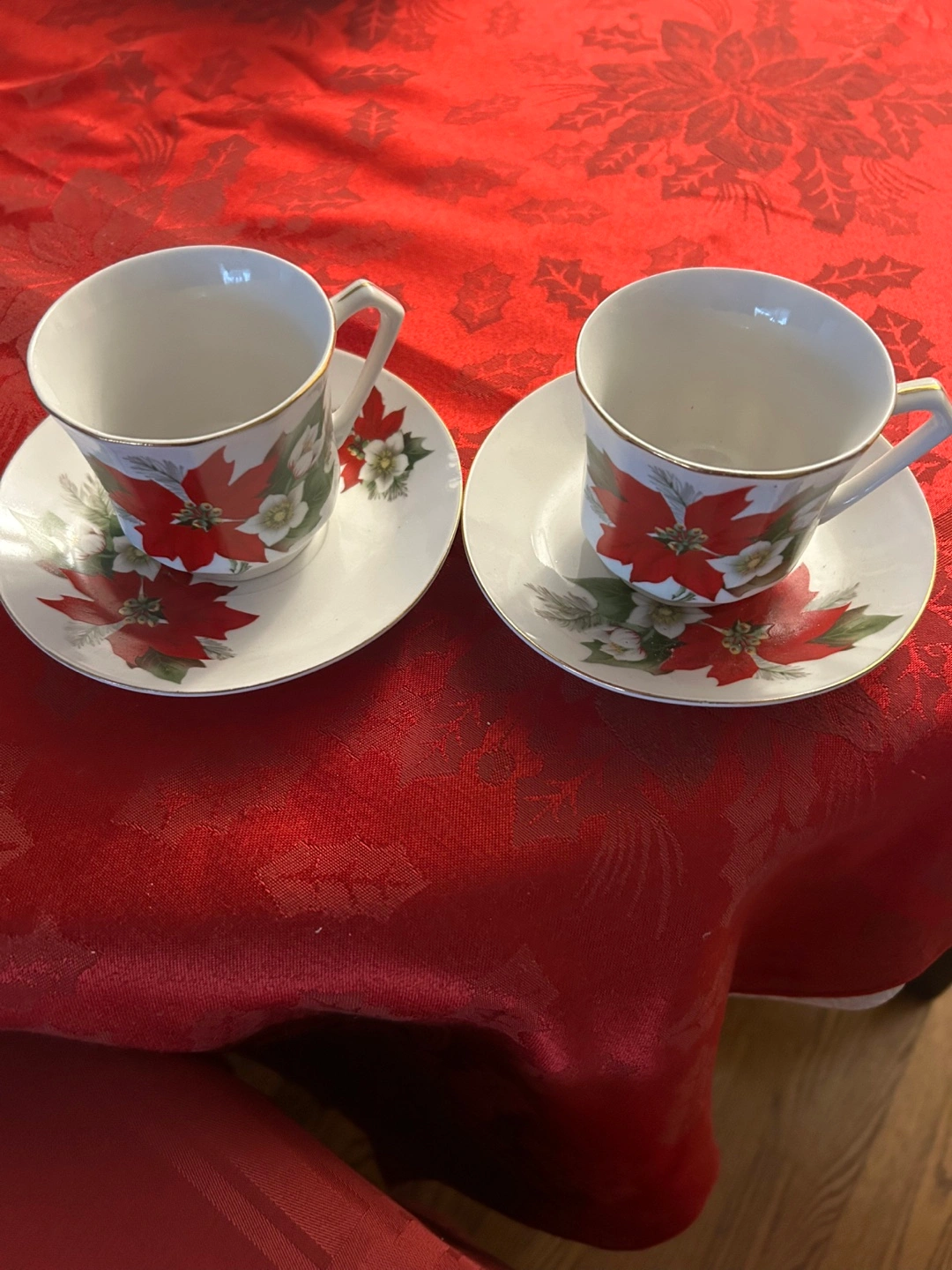 Two teacups in excellent condition and saucers, featuring a poinsettia design. Gold trim. (One of the saucers has a small chip)
